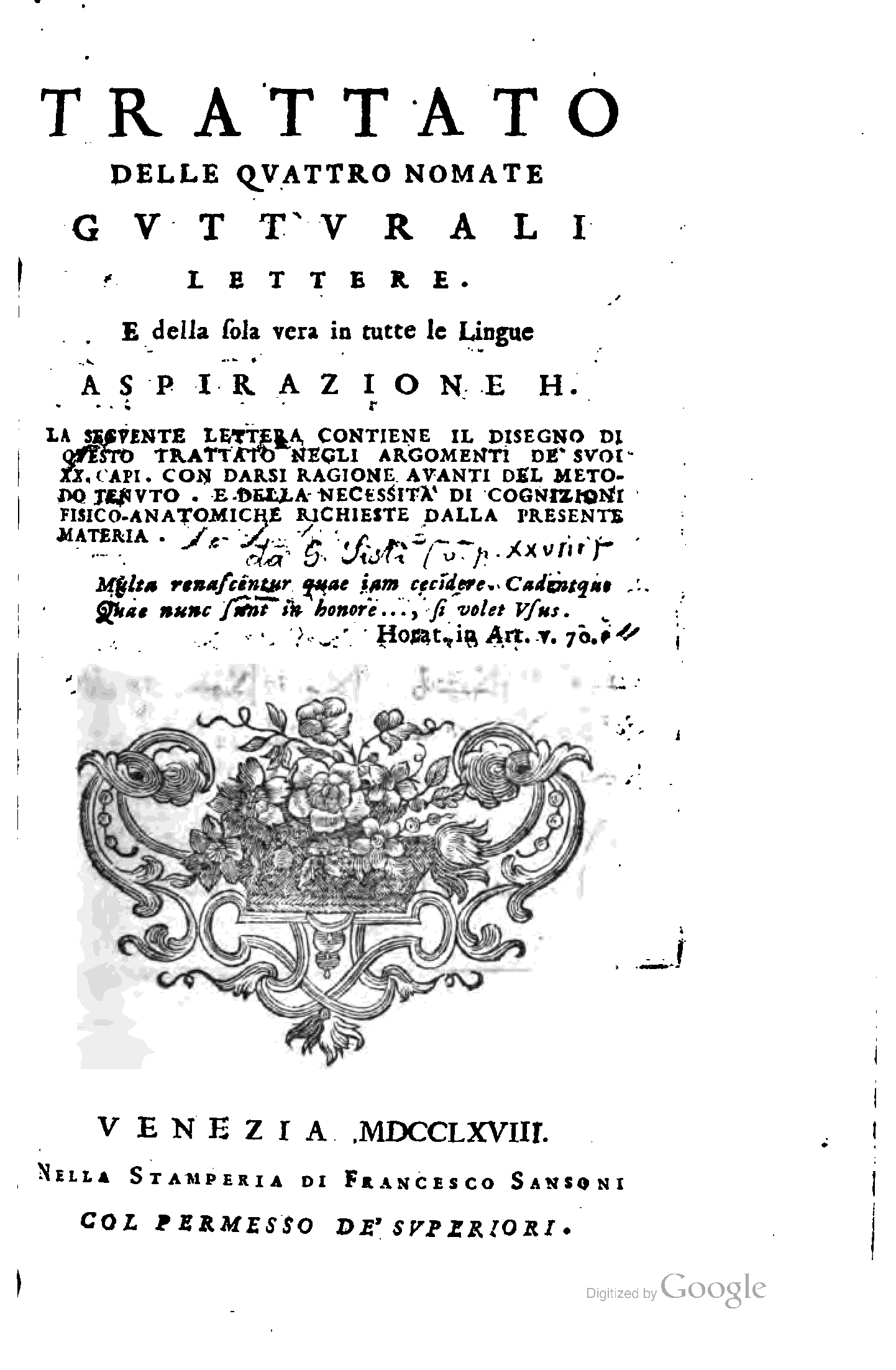 "Trattato delle quattro nomate gutturali lettere, e della sola vera in tutte le lingue aspirazione H., etc" - читать интересную книгу автора (Gennaro Sesti) |