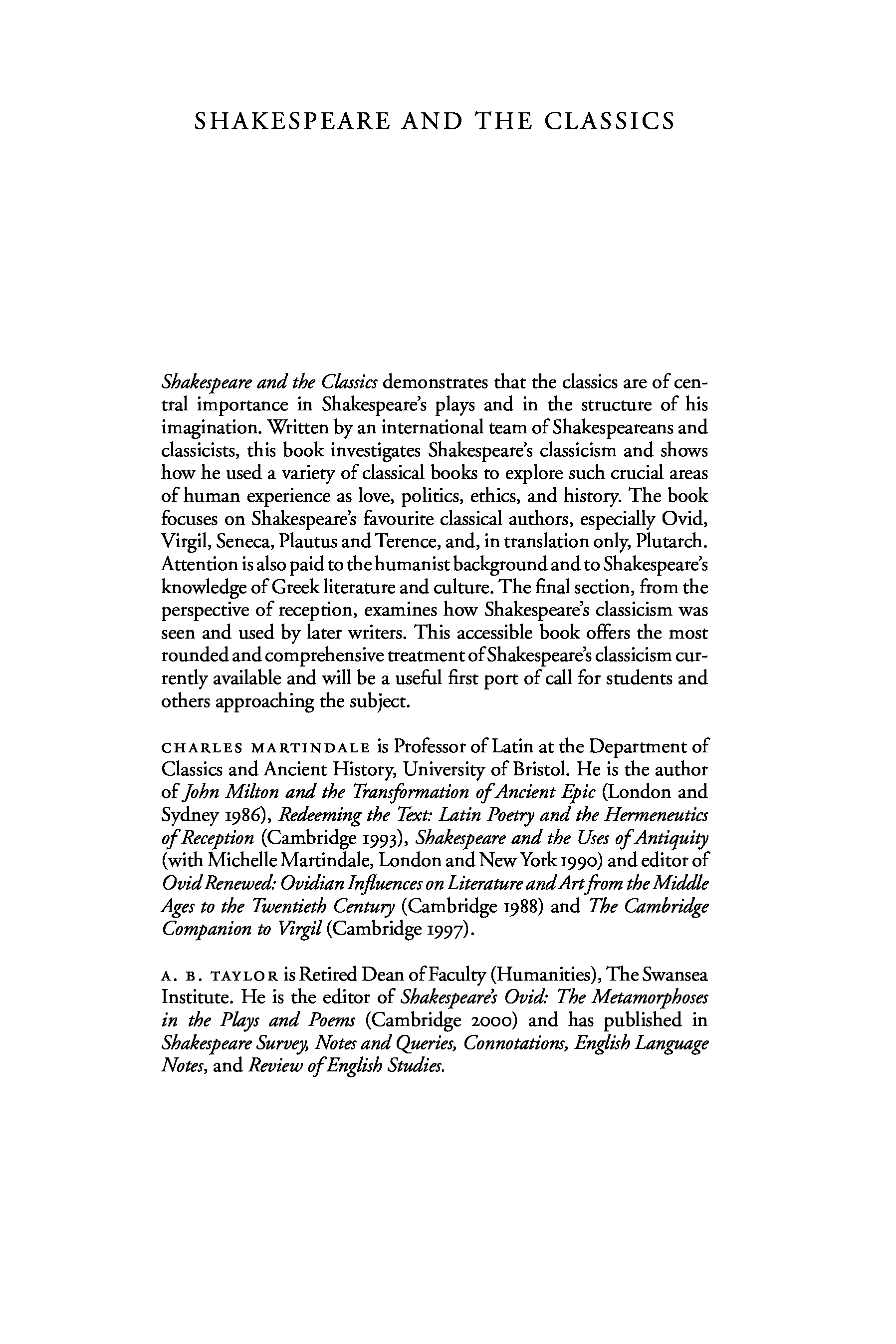 "Shakespeare and the Classics" - читать интересную книгу автора (Charles Martindale, A. B. Taylor)