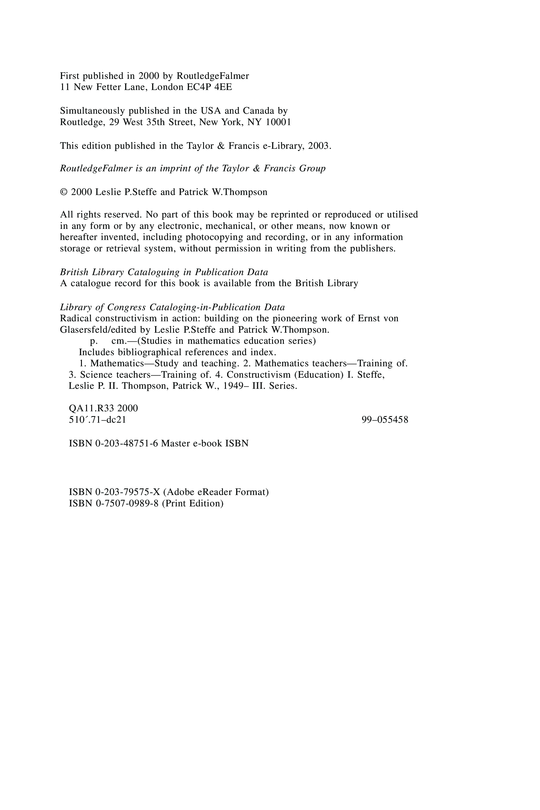 "Radical Constructivism in Action: Building on the Pioneering Work of Ernst von Glasersfeld (Studies in Mathematics Education Series)" - читать интересную книгу автора (Leslie P. Steffe; Patrick W. Thompson) |