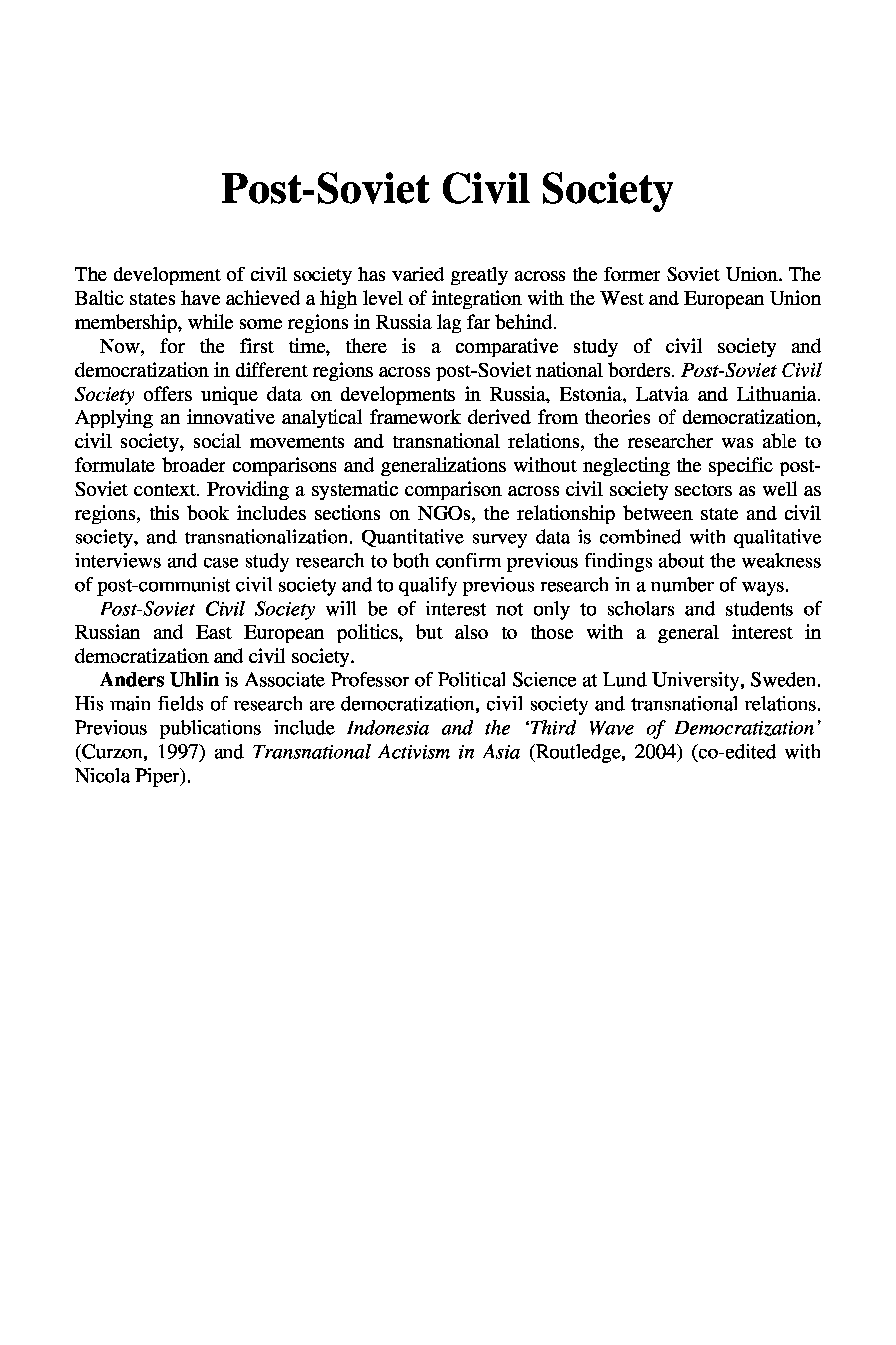 "Post-Soviet Civil Society Democratization in Russia and the Baltic States (Basees Routledge Series on Russian and East European Studies)" - читать интересную книгу автора (Anders Uhlin) |