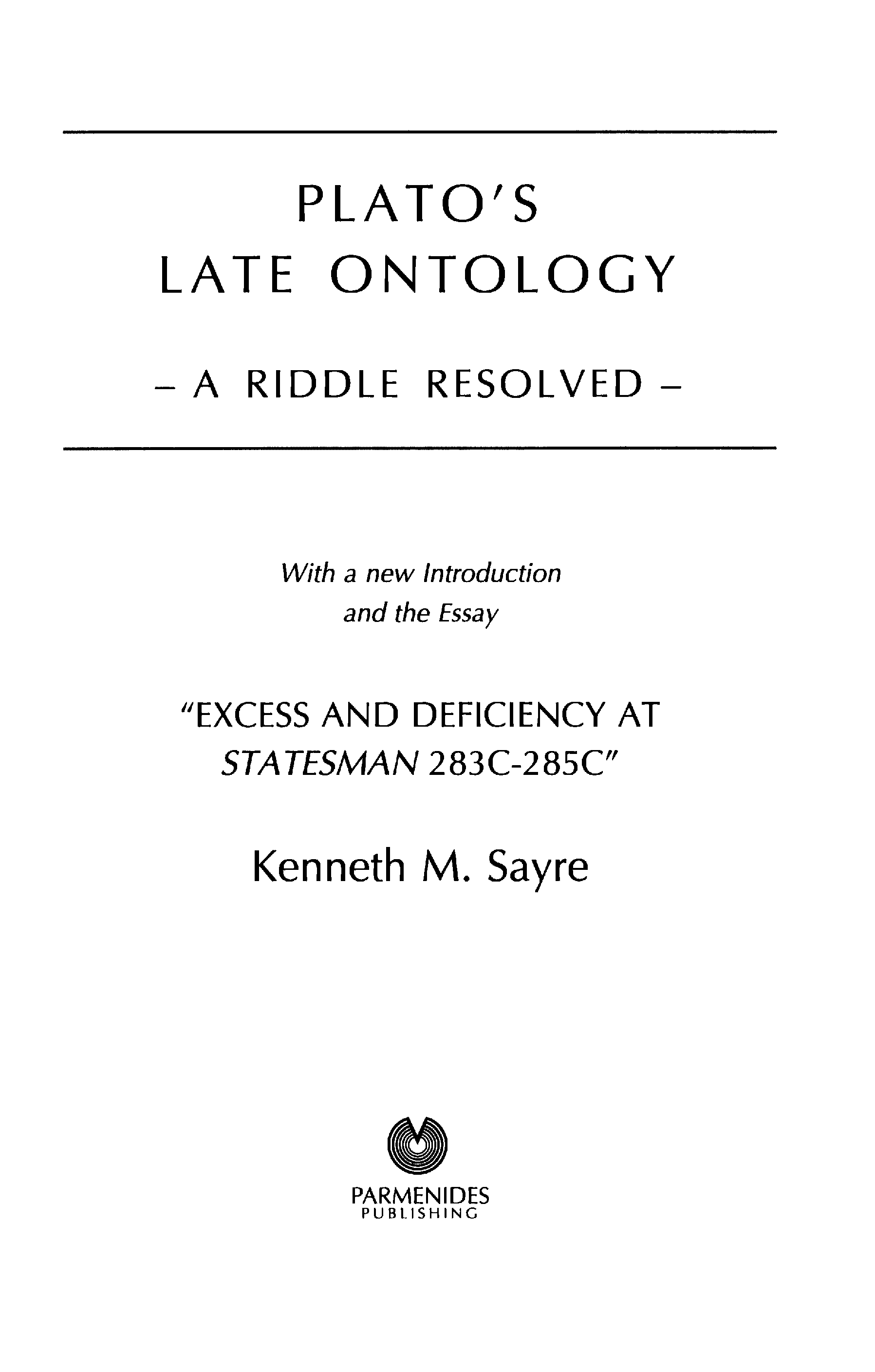"Plato's Late Ontology: A Riddle Resolved; with a new Introduction, and the Essay ''Excess and Deficiency at Statesman 283C-285C''" - читать интересную книгу автора (Kenneth M. Sayre) |