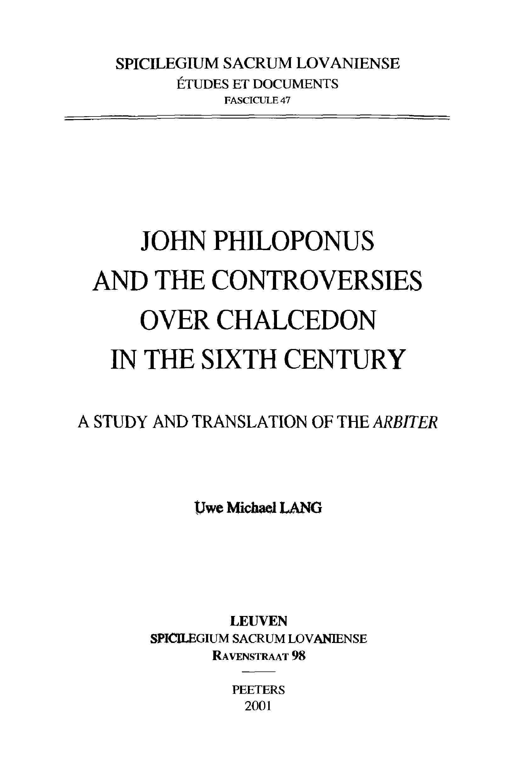 "John Philoponus and the Controversies over Chalcedon in the Sixth Century. A Study and Translation of the Arbiter (Spicilegium Sacrum Lovaniense. Etudes et documents 47)" - читать интересную книгу автора (U.M. Lang)