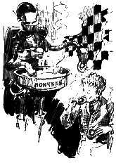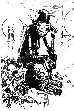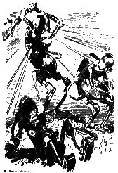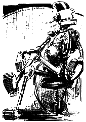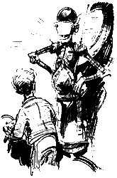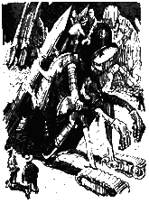 Круг. Ещё круг. Серёжа не успевал поворачивать педали. Голова кружилась. Деревья перемешались с цифрами на экране туготрона. Ещё круг. Серёжа задыхался от беспомощности и обиды. Р-раз! Он спрыгнул с велосипеда и покатился по траве. — Ха-ха-ха! — закричали электронные смехачи туготронов. Хамиан-14 остановил велосипед и притянул его к своим щупальцам. — Можешь стереть этот левосипед из своей памяти, — сказал он Серёже. — Сейчас я привинчу его к спине. Отвёртку! — гаркнул он. Все туготроны вытащили из коленей по здоровенной отвёртке. — Привинти-ка мне, Автошлеп, этот левосипед на спину! — приказал Хамиан-14 туготрону с медной заплатой на животе. — Сию микросекундочку! — отозвался Автошлеп и укрепил велосипед между железных лопаток Хамиана-14. — А ты, Ненамагниченный, ступай! Да скажи, чтоб тебе выдали экран и немного начинки для головы. Приветик! — Хамиан-14 зашагал с велосипедом на спине вдоль берега озера. Автошлеп и остальные туготроны пошли в другую сторону. У Серёжи все ещё кружилась голова. «Надо поскорее найти человека и хоть какую-нибудь еду», — думал он. Он посмотрел вслед туготронам. Они мерно топали по дороге, поднимая столбы пыли. «Пойду посмотрю, куда они идут», — решил Серёжа и двинулся за туготронами, прячась за кусты и деревья. Позвякивание гусениц доносилось до него издалека, и временами ему казалось, что впереди двигается по просёлочной дороге трактор. Туготроны остановились неподалёку от озера. Выглянув из-за куста, Серёжа увидел, что двое из них остановились у каких-то белых тюков. — Начнём выбрасывать? — услышал он голос первого туготрона. — Не хватает двух мешков, — ответил второй. — Чего там Автосек замешкался? — Молотит пшеницу! У Серёжи захватило дух от радости. — Пойдём поможем, — предложил первый туготрон. Оба туготрона отвинтили свои левые руки и, взяв их под мышку, как рабочий инструмент, отправились по дороге в поле. — Техника на грани фантастики! — прошептал Серёжа. Туготроны исчезли за поворотом, и скрип их гусениц постепенно замирал. Мешки, мешки, мешки тянулись вдоль берега озера. В небе плыла только одна летающая платформа. От неё оторвался туготрон-ракета и начал кувыркаться в воздухе. Больше никого не было видно. Серёжа подошёл к мешку, что стоял поближе. «Что это они выбрасываний Мешок был перевязан обыкновенной верёвкой. «Наверно, это какой-нибудь особый туготронный узел», — подумал он, вытягивая конец бечёвки из первой петли. Но узел оказался самый обыкновенный морской, и верёвка распутывалась весело и послушно. Наконец горловина мешка раскрылась. Серёжа зачерпнул горсть мелкой и нежной пудры и понюхал её. Она ничем не пахла. Тогда он растёр её в руках и лизнул палец. — Не может быть! — прошептал он. В мешке была мука. Обыкновенная мука, из которой делают блины и пельмени, пирожки и оладьи, пончики и вареники. Наконец просто пекут хлеб. Свежий, душистый хлеб! Тот самый хлеб, который Серёжа не ел уже столько дней! Серёжа начал торопливо ссыпать муку в свои карманы. Она текла из руки тонкой струйкой, перемешиваясь в кармане с обрывками проволоки и шарикоподшипниками. «Спасён от голода!» Но тут железные щупальца рванули Серёжу в воздух, отнесли в сторону и поставили на землю. Перед Серёжей стоял туготрон-ракета. Трава под его плавниками дымилась. Маленькая головка с горящими глазами быстро вращалась. — Я за