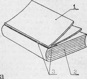 Мелкой наждачной бумагой обрабатывают корешок книжного блока, удаляя с него остатки бумажной обложки (до клеевого слоя) или создавая гладкую поверхность корешка, если речь идет о листовом материале. Ножовкой с мелкими зубьями (удобно пользоваться шлицовкой) пропиливают пазы в корешке блока под углом 45° к его основанию на глубину 3–4 мм. Пазы — парные типа «ласточкин хвост» распределены по корешку равномерно (рис. 9). Обычно 3–4 пар пазов бывает достаточно. Расстояние между пазами пары по корешку не превышает 25–30 мм, а крайние пропилы должны отстоять от верхнего и нижнего обрезов блока не менее чем на 15 мм. Обмотку «ласточкиных хвостов» начинают с паза 1 первой пары пропилов. Обмотку ведут прочной нитью (лучше капроновой), укладывая ее виток к витку с достаточным натягом (всего нужно 2–3 витка). Не обрывая нити, делают столько же внтков, используя вторую пару пропилов, и т. д. В последнюю пару пазов укладывают на 1–2 витка больше, чем в предыдущие, и, не обрывая нити (она уже будет проходить по противоположной стороне книжного блока), возвращаются к первой паре пазов, поочередно наматывая на каждый «ласточкин хвост» блока по 1–2 витка. Конец и начало нити, находящиеся в пазе 1, завязывают узлом, стараясь, чтобы он оказался внутри паза. Остается проклеить корешок блока, следя за тем, чтобы клей попал в пазы и хорошо пропитал нити, находящиеся в них. Если пазы получились слишком широкими, в них закладывают отрезки пропитанной клеем пеньковой или хлопчатобумажной бечевки (шнура), обеспечивая надежность корешка блока. Опыт переплетчиков-любителей и самих авторов показал, что подобные книги раскрываются лучше, чем шитые втачку. К готовому книжному блоку необходимо приклеить форзацы, без которых нельзя соединить блок с крышками переплета. Форзацы приклеивают к первому листу первой и последнему листу последней тетради блока. Заметим, что форзацы должны иметь долевой раскрой, то есть долевое направление волокон бумаги форзаца должно совпадать с его корешковым сгибом. Для определения направления волокон смачивают водой небольшой участок бумаги: в долевом направлении бумага мало деформируется, а в поперечном становится волнистой. В современных книгах применяют три типа форзацев. Чаще всего встречается приклейной форзац (рис. 10, а), представляющий собой сложенный вдвое лист бумаги. Высота форзаца равна высоте блока книги, а ширина — двойной ширине тетради блока. Для присоединения форзацев к тетрадям вдоль корешкового сгиба форзаца наносят полоску клея шириной 3–4 мм и приклеивают к корешковому полю соответствующей тетради так, чтобы сгиб форзаца был вровень с корешковым полем тетради или корешковым обрезом блока книги. Если же последовать совету многих пособий по переплетному делу и присоединить форзац на расстоянии 3–4 мм от корешка блока, то после вставки блока в переплетные крышки, форзац может оказаться разорванным при первом же открывании книги! В книгах большого объема используются приклейной форзац с окантовкой, которая увеличивает прочность приклейного форзаца (рис. 10, б). В этом случае после приклейки форзаца к тетради блока корешковая часть тетради окантовывается полоской ткани или прочной бумаги шириной около 15 мм, густо смазанной клеем. Полоска окантовочного материала приклеивается так, чтобы она на 3–4 мм одним своим крае