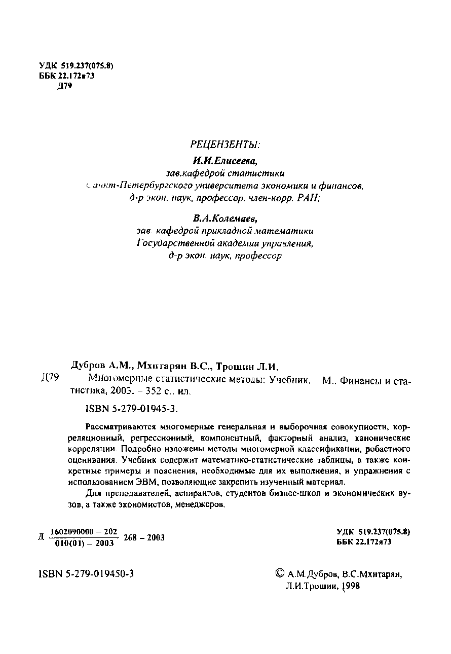 "Многомерные статистические методы" - читать интересную книгу автора (Дубров А.М., Мхитарян В.С.,Трошин Л.И.) |