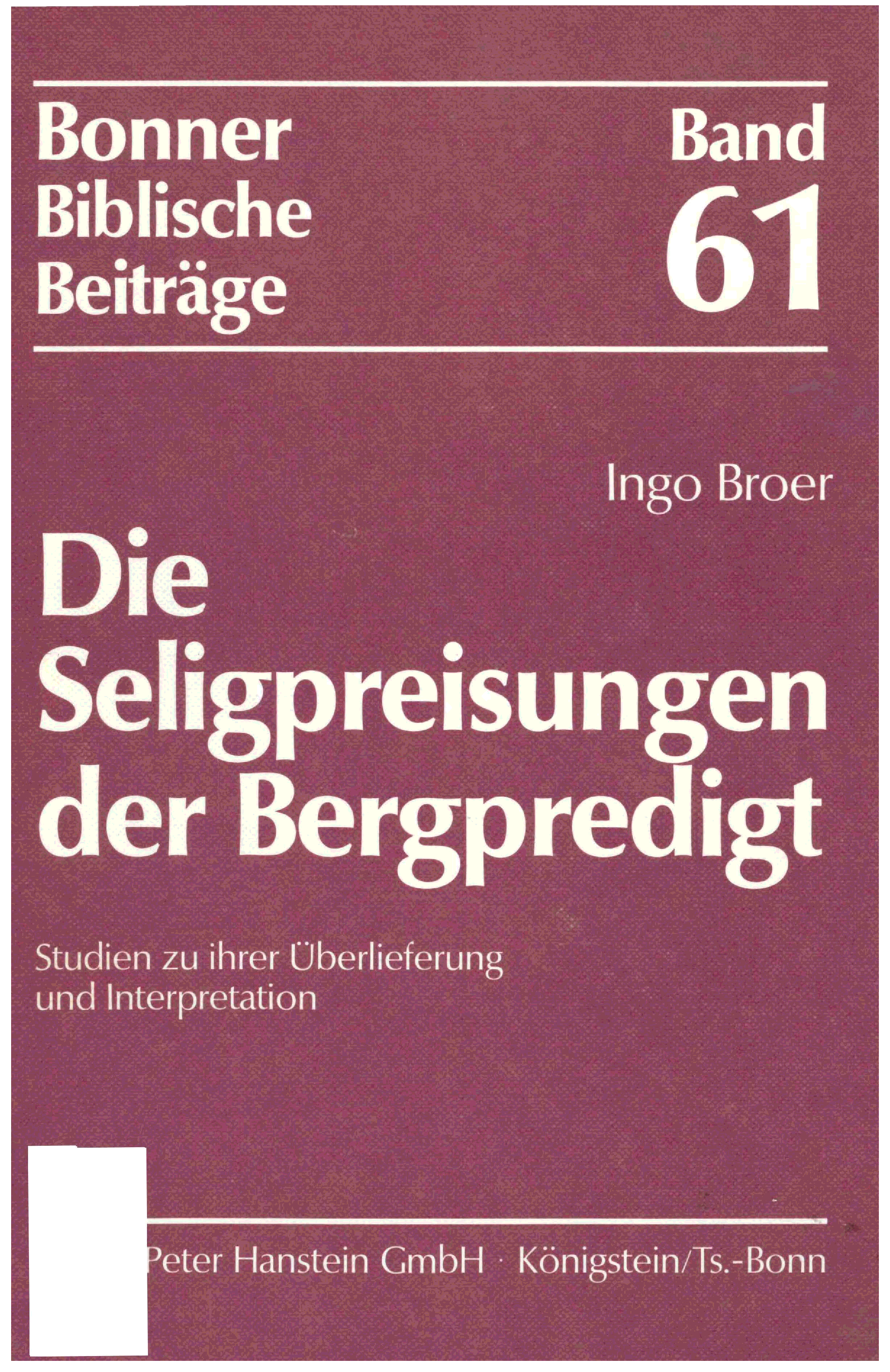 "Die Seligpreisungen der Bergpredigt. Studien zu ihrer Überlieferung und Interpretation (Bonner Biblische Beiträge 61) " - читать интересную книгу автора (Ingo Broer) |