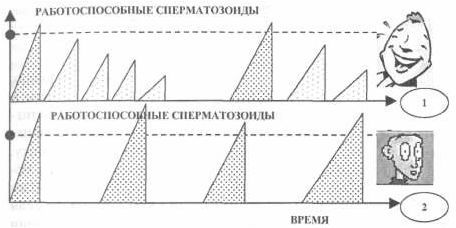 Возьмем систему координат и по горизонтальной оси будем откладывать время. Предположим, что у первого и у второго мужчин одинаковый цикл выработки работоспособных сперматозоидов. После оргазма спермии были десантированы. Но у первого способность к повторению появилась очень быстро, и он сделал свое дело. Потом опять и опять. У второго таких способностей не оказалось. Он смог повторить только после того, как спермии выработались в достаточном количестве и многие из них стали работоспособными. С точки зрения эволюции второй тип предпочтительнее. А с точки зрения современной женщины — нет. Видимо, Природа создала первый тип для «разогрева» и насыщения женщины, для подготовки ее к зачатию от второго, спермии которого дали лучшее потомство. Один создан для секса, но полюбить и вызвать ответное чувство не может. Второй — для любви, чувства и для потомства. Первые потомства в условиях полигамии дать не смогут, вторые будут активно размножаться.