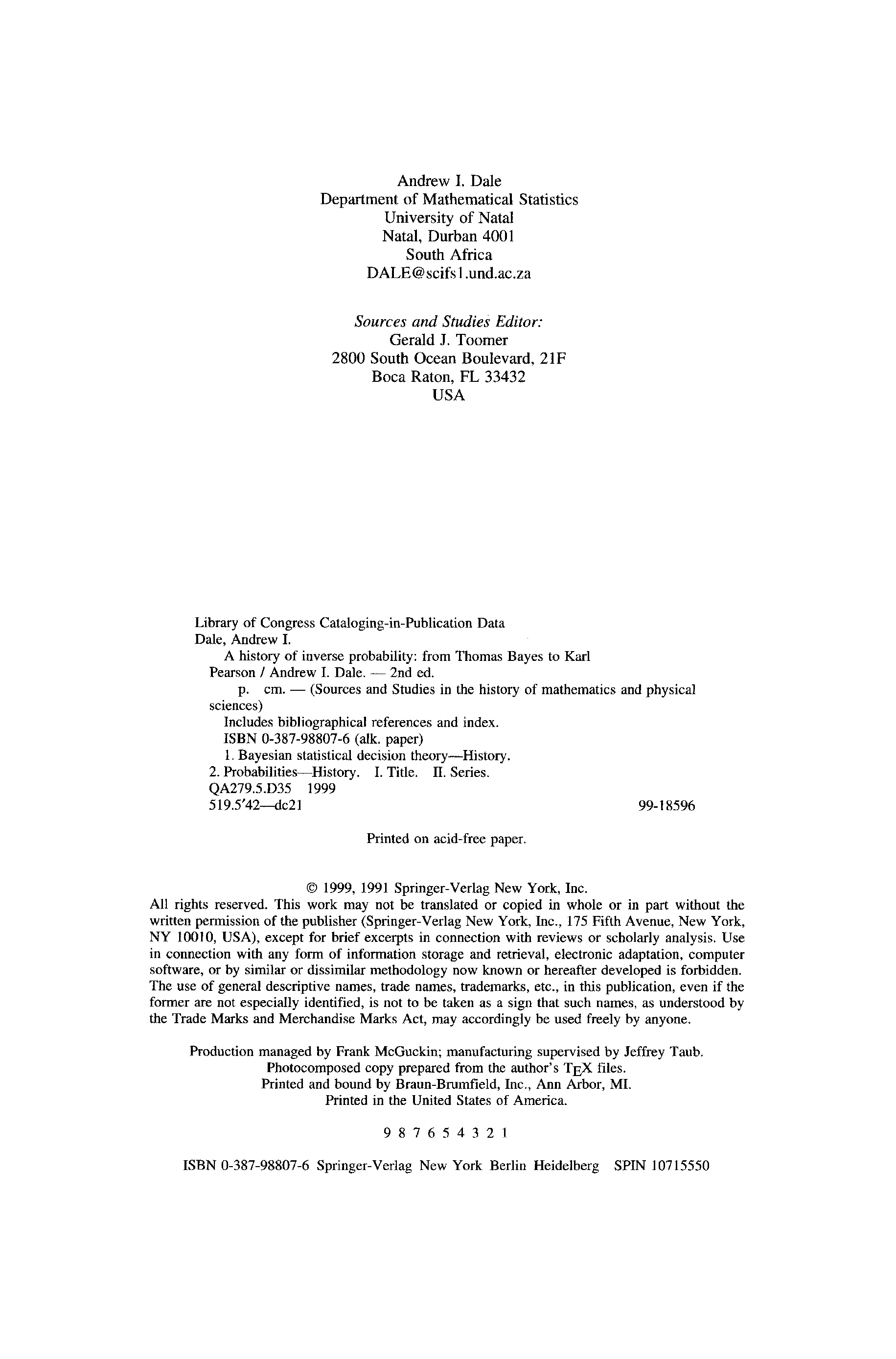 "A History of Inverse Probability: From Thomas Bayes to Karl Pearson (Sources and Studies in the History of Mathematics and Physical Sciences)" - читать интересную книгу автора (Andrew I. Dale) |
