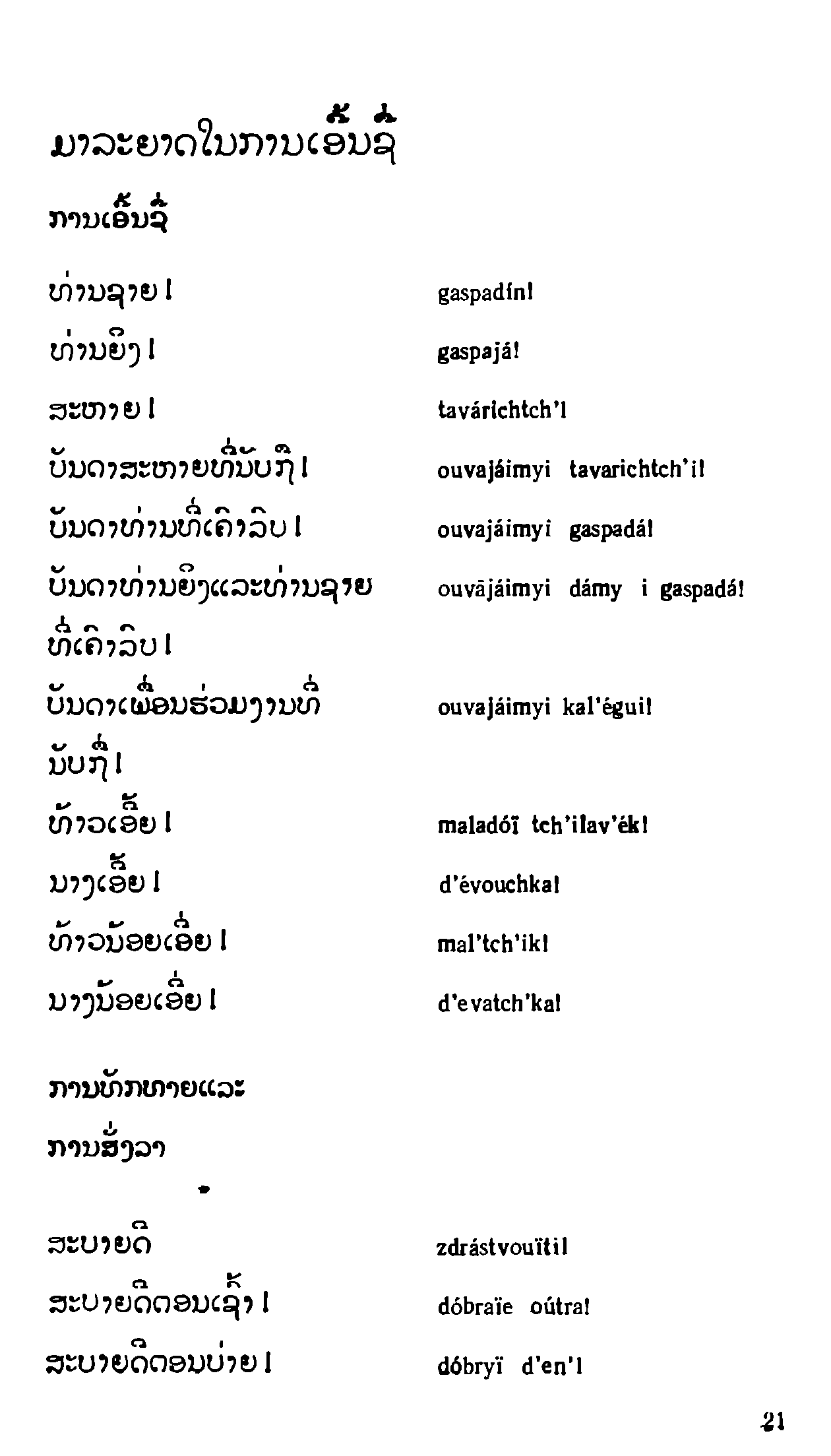 "Русско-лаосский и лаосско-русский разговорник" - читать интересную книгу автора (Соболева В. С, Плам Ю. Я., Чантхависук В. и др.) |