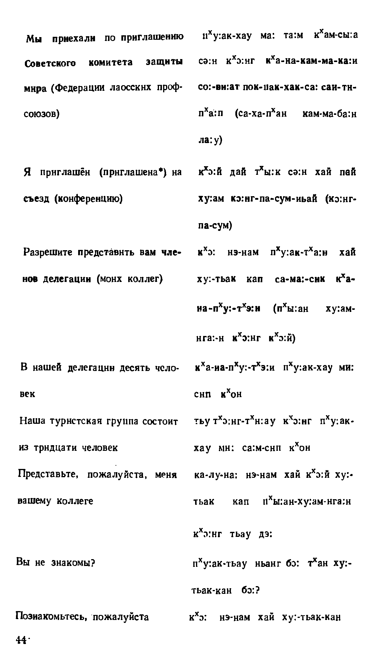 "Русско-лаосский и лаосско-русский разговорник" - читать интересную книгу автора (Соболева В. С, Плам Ю. Я., Чантхависук В. и др.) |