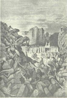 Жители Иерихона взирали на все случившееся уже не только с любопытством, но и со страхом. И все же крепость по-прежнему казалась им неприступной. Иисус Навин, однако, не торопился со штурмом. Он предпринял то, что сейчас мы назвали бы психической атакой. По его приказанию священники с ковчегом завета в сопровождении трубачей с высоко подъятыми серебряными, «юбилейными» трубами, должны были вместе со всем народом в продолжение шести дней обходить Иерихон, соблюдая при этом полнейшее молчание. И вот каждый день колонны израильтян, в глубоком, как бы траурном или молитвенном, безмолвии, начали по кругу о6ходить иерихонские стены. Едва ли не все жители города собрались в это время на высоких и широких стенах не зная, что и думать, но невольный страх, закрадывавшийся в их души при виде непонятного зрелища, с каждым днем все усиливался, переходя в ужас, вызывая у женщин истерику, а у мужчин оцепенение. Но так и должно было быть по замыслу Иисуса Навина, решившего деморализовать своих врагов столь необычным способом. На седьмой день, во время очередного шествия, высокие серебряные трубы, казавшиеся дотоле безмолвным украшением, вдруг оглушительно взревели. Звук их был так силен и ужасен, что, смешавшись с воинственными воплями многотысячных толп народа, потряс и разрушил стены крепости. Накренились и упали его башни, рухнули бойницы, а по ним через завалы и проломы широким потоком ринулись войска и толпы израильтян. Иерихон, кроме дома предусмотрительной Раав, был разрушен до основания. И сейчас еще можно видеть развалины Иерихона, они поражают колоссальными обломками крепостных стен, по которым видно, что рассказ о могуществе этой крепости, записанный в Библии, не был преувеличением. Впоследствии в нескольких километрах от разрушенного Иисусом Навином города был построен новый Иерихон. Сейчас в нем живет около десяти тысяч жителей. Городок мал, но живописен, он существует на доходы, получаемые от многочисленных туристов, осматривающих иерихонские развалины. Увы, земля обетованная, похожая на рай, с ее стройными пальмами, лимонными рощами, тщательно возделанными плодоносными полями и обжитыми городам, была с приходом Иисуса Навина обагрена кровью, обуглена пожарами, покрыта трупами. Ее чистые воды были красны от крови и серы от пепла. Страна долго не сдавалась. Израильтяне завоевывали ее в течение долгих семи лет. Иерихон был лишь первой крепостью, правда самой сильной, которую взял Иисус Навин, сразу двинувшийся дальше — к крепости Гай, а затем в Гаваону. У стен города Гай, находившегося неподалеку от Иерусалима и совсем недалеко от Вефиля, израильтяне неожиданно потерпели первое крупное поражение. Сама по себе крепость была невелика, стены ее не шли ни в какое сравнение с иерихонскими, защитников тоже было намного меньше, чем в Иерихоне. Лазутчики, посланные Иисусом Навином, донесли, что Гай можно взять без осады — одним штурмовым ударом. Иисус Навин явно недооценил мужественный дух защитников Гая. Зная о гибели Иерихона, они сумели подготовиться значительно тщательнее своих побежденных предшественников, а кроме того, решили сражаться до последнего — за каждый дом, за каждый выступ крепостной стены, за каждую бойницу. Войска же Иисуса Навина, успокоенные легкой победой над Иерихоном, были в моральном отношении намного слабее сво