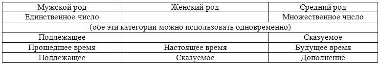 Количество грамматических понятий, которые вы бы хотели объяснить малышу, можно увеличить. На первых порах таблица должна быть перед глазами ребенка. Говорите ему несколько слов или фразу, ребенок должен их повторить, хлопая рукой каждый раз по соответствующей клетке.