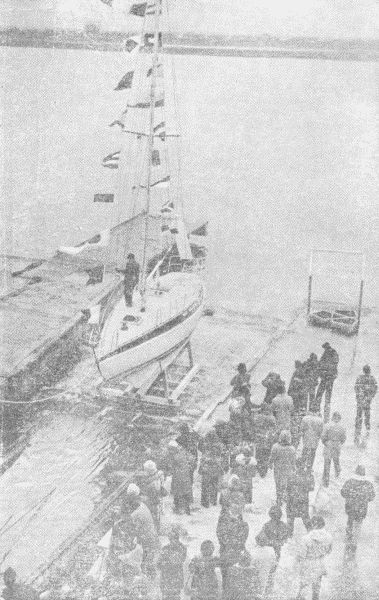 "Первая вокруг света" - читать интересную книгу автора (Хойновская-Лискевич Кристина)СтартНаступил еще один чрезвычайно важный этап подготовки: такелажная мастерская изготовила такелаж, парусная — сшила паруса. Движитель моей яхты был существенным элементом всего мероприятия. Я и в прежних рейсах всегда заботилась об этом. Мои заботы разделяла верфь. Паруса и такелаж были выполнены ею так, что на починку парусов я потратила в плавании считанные часы, а запасные тросы к стоячему такелажу вообще обошли весь свет нетронутыми. Глаза и уши судна — электронные устройства — проверил пан Богуслав, когда-то Богусь Возный со «Сварожица»,[4] а сейчас доктор технических наук. Яхта была готова. Близилась церемония ее крещения. Это всего лишь красивый обычай, но для меня он был трогательным и важным. Я всегда считала момент соприкосновения судна с водой его рождением. А тут предстояло рождение моего судна! 21 декабря верфь приняла праздничный вид. Ветер играл флажками, развешанными от ворот до набережной, громко звучали веселые мелодии и бравурные марши. Разукрашенный «Конрад 32», пока еще заводской номер один, возвышался на слипе. Собрался почти весь коллектив верфи, пришли друзья, моя семья. Настроение тоже было почти семейное. Мне казалось, что это наш общий праздник судостроителей, главным героем которого должна стать «Мазурка». Появились официальные гости и крестная мать. И тут я допустила первую оплошность — исключительно по незнанию манер высшего света и непониманию важности собственной персоны. Директор верфи представлял прибывшим коллектив строителей яхты, а затем дошел до меня: — А это пани капитан «Мазурки».