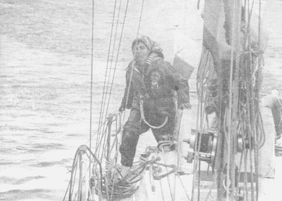 "Первая вокруг света" - читать интересную книгу автора (Хойновская-Лискевич Кристина)«Мазурка» обходит земной шарТри дня стояла отличная погода. Умеренный ветер и такое же состояние моря служили прекрасным движителем, и «Мазурка» хвасталась все более длительными суточными пробегами. К тому же наступила приятная теплынь: 19 °C ночью и выше 30 °C днем. Плыла я в купальнике, а иногда и без него, но обязательно в белой шляпе и защитных очках — солнце не шутило. Близость экватора несколько осложняла обсервацию в полдень. Момент кульминации был в полном смысле слова моментом: солнце неслось по небу со скоростью экспресса, и его нужно было, действительно, ловить. Зато обсервация звезд при ясном небе не составляла труда. За сутки прибывал градус с гаком широты. Пожалуй, на экватор я попала в самом подходящем месте. Столько всего хорошего происходило на «Мазурке», а пока это была наша с ней тайна. Вечерами я настойчиво вызывала Гдыню-Радио, но в ответ слышала «пири-пири». Все изменилось неожиданно. 13 марта, закончив вечерние навигационный и кулинарный обряды, я растянулась на койке. Вероятно, задремала, но что-то заставило меня проснуться — не звук, не поведение яхты, а сознание, что я должна встать. Духов на «Мазурке» не было, только тараканы, с которыми я давно мирно сосуществовала. Часы показывали 21.00. Вскочила, настроила приемник. На этот раз «пири-пири» молчало. Ясный мужской голос произнес: «Мазурка», «Мазурка», — вызывает Гдыня-Радио». Мгновенно включила передатчик: через 30 секунд ответила. Слышимость была отличной в обоих направлениях. Сообщила свои координаты, определенные два часа назад по звездам. Оператор повторил: 4° 07' северной широты и 29° 05' западной долготы. Затем передала сообщение о плавании, состоянии яхты и экипажа. Договорились о связи на завтра в это же время. Закончив разговор, я исполнила с Альбатросом победный танец. Информация о «Мазурке» ушла в эфир, мой дорогой муж и все остальные больше не будут огорчаться! По мере продвижения на север пассат усиливался и море становилось все более активным. Плыть с таким ветром было бы только приятно, однако плавание круто в бейдевинд под «шестерку» или «семерку» — тяжелая работа для яхты, парусов и такелажа. Мертвая зыбь также усилилась — добавились короткие крутые локальные волны от ветра и течения. Это была езда по булыжникам с тряской на мертвой зыби. Правда, очень эффективная — по 130–140 миль в сутки, но мучительная. С 11° северной широты ветер скоростью 30–40 узлов стал ежедневным гостем. Постепенно сокращала паруса: большие генуи уступили место меньшим, а те, в свою очередь, кливерам. Ясное небо потихоньку заволакивали тучи, иногда выпадали осадки. В общем, было серо, ветрено, мокро и холодно. Ветер стал шквалистым, особенно в период между утренней обсервацией и обедом. Потом немного успокаивался. Вечернее изменение давления пригоняло очередную партию туч, из которых с 22.00 дуло так, что отрывало голову. Я целилась в узкие воротца, которые были отмечены на карте океана координатами от 13 и 14 апреля 1976 г. Там стремилась завязать узелок на двухлетней петле вокруг земного шара. 20 марта после полуденной кульминации определила, что осталось всего 16 миль. Сказала об этом «Каурке» и Альбатросу, а сама ударилась в панику. 16 миль — это очень мало и очень много. Вроде ничего не должно случиться, а 