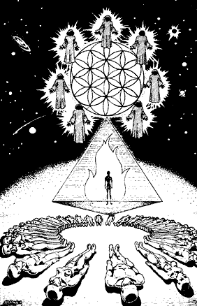 Жители этой планеты, зовущиеся нефилимцами, пришли на Землю четыреста тысяч лет назад. Тот не говорит о причине их появления, но Захария утверждает, что те нуждались в золоте для своей атмосферы. Вот что он говорит в своем " Итак, они прибыли сюда, чтобы раздобыть золото. После 200000 лет принудительного труда золотодобытчики возмутились и решили создать расу низших рабов, то есть нас. Примечательно, что в древнейших шахтах Южной Африки археологи обнаружили кости Homo Sapiens и артефакты, восходящие к пятидесятитысячным годам до Рождества Христова. Существует мнение, что добыча золота в Южной Африке восходит к гораздо более древней эпохе. Ситчин утверждает, что нефилимцы создали нас 300000 лет назад, но Тот категоричен в этом вопросе. По его подсчетам мы были созданы ровно 200209 лет назад (если вести отсчет от 1994 года). Ситчин выдвигает теорию, что мы возникли в результате генетических экспериментов нефилимцев, но, согласно Тоту, нефилимцы не могли проводить их самостоятельно. Они нуждались в помощи существ, живущих вне Солнечной системы. Посторонняя помощь пришла из известного источника. Жители Сириуса создали нас, объединив свои усилия с немфилимцами. Вначале они опустились в океан и появились оттуда в образе полурыб-полулюдей. Они погрузились под воду, чтобы вступить в контакт с дельфинами, находящимися на том же уровне сознания, что и они. Согласно Тоту, жители Сириуса решили покинуть Землю в определенный исторический момент, но они также хотели оставить на планете необходимый уровень сознания. Семь существ, освободившись от тел, сформировали сферы сознания. Они слились с семенем жизни и создали яйцо. Когда эти семеро существ соединились таким образом, чтобы возникла геометрическая фигура семени жизни, вспыхнуло пламя высотой в четыре фута бело-голубого цвета. Оно было холодным, но выглядело как огонь. Затем оно было водворено в " Залы Аменти - древнее место, созданное около пяти с половиной миллионов лет назад. В действительности же никто не знает, когда возникли Залы Аменти, так как пять с половиной миллионов лет тому назад произошло некое событие, разрушившее Хроники Акаши нашей планеты. Помните, хотя история нашей планеты насчитывает более 500 миллионов лет, мы имеем доступ только к последним пяти с половиной миллионам лет. Собственно говоря, Залы Аменти - это искривление пространства, напоминающее матку. Туда ведет только один вход, но, проникнув вовнутрь, вы словно попадаете в бескрайний космос. Подобные искривления всегда находятся на один пространственный обертон выше вибрационного уровня Земли. Обычно они располагаются на расстоянии 440 000 миль от Земли, но во время существования Атлантиды это искривление пространства находилось на земной поверхности. Сейчас оно погрузилось на 1000 миль вглубь Земли. Друнвало был допущен в первый зал, где он увидел большую пирамиду внутри главного золотого прямоугольника. В самой же пирамиде горел огонь. Синхронная подготовка к перекрестному осеменению проводилась на Сириусе В, а точнее, на третьей планете этого светил. Шестнадцать мужчин и шестнадцать женщин, образовав шестнадцать семейных пар, прибыли с Сириуса В прямо в Огонь Залов Аменти. Они легли и слились с пламенем. Этот акт зачатия на Земле длился две тысячи лет. Таким образом возникли две различные расы: одна с Нирбу, другая с Сириуса. С