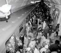 Другая проблема – вентиляция станций. В любой сезон в метро душно, а в жаркое время – особенно. Первые линии метро проветривались естественным образом. Свежий воздух попадал в тоннели через вентиляционные шахты и переносился поездом от станции к станции благодаря так называемому поршневому эффекту. После войны метрополитен стали оборудовать механическими вентиляторами, которые нагнетали свежий воздух через шахты, а отработанный удаляли наружу. Летом свежий воздух притекает сначала на станцию, а потом попадает в перегонный тоннель, откуда его вытягивают вентиляторы. Зимой система обратная: сначала воздух попадает в тоннель, где он успевает нагреться, и следует за поездом на станцию. Специально станции не отапливают, но на входе в вестибюль устраивают «тепловую завесу», которая оставляет холодный воздух снаружи. И все равно в метро часто бывает душно, особенно в жаркое время. Вагоны переполнены, стоящие поезда, как пробки, затыкают воздуховод, не спасают даже новые вентиляторы. Ежегодно в Московском метро гибнет около 250 человек, причем большинство – от духоты. Инфаркты, инсульты, приступы астмы. Не более 20% жертв составляют попавшие под поезд намеренно или случайно. В последнем случае у пассажира еще есть шанс спастись – добежать до края платформы или укрыться в глубоком желобе между рельсами. Если трагедия все же случилась, машинист обязан оставить поезд на месте до прибытия бригады «скорой помощи». После ЧП машинисту по закону положены три дня на восстановление душевных сил. Вопреки распространенному мнению два ходовых рельса, по которым движется поезд, совершенно обесточены. А вот прикосновение к контактному рельсу, идущему вдоль всей платформы, – верная смерть. Напряжение в нем достигает 825 вольт. Правда, он одет в толстый кожух из стекловолокна, но нижняя часть открыта – по ней скользит токоприемник вагонов. Влезть на платформу или спуститься с нее можно только в начале и в конце платформы – там на экстренный случай имеются лестницы. Когда метро прекращает работу, на пути выходят бригады уборщиков – они собирают все, что за день накидали пассажиры. Другие уборщики отмывают платформы при помощи машины. В течение дня станции моют машинами поменьше с нежным названием «Ромашка», которые приходится толкать вручную. Иначе к вечеру пол будет покрыт таким слоем грязи, что даже машина не справится. Поезда метро не остаются под землей на ночь. Как только прекращается движение, вагоны следуют в электродепо – их в Москве 15, чуть больше, чем линий. В депо механики осматривают вагоны в поисках неполадок. Сегодня в метро работают вагоны трех типов. Самый старый из них – голубой «Е» с кожаными диванами, введенный в строй еще в 60-е годы. Накануне Олимпиады его сменили почти неотличимые 81-714 и 81-717. Совсем недавно на рельсы вышли экспериментальные вагоны типа «Яуза», но они пока ходят только по Люблинской линии. Весь подвижной состав для метро производят на подмосковном заводе в Мытищах. Новенькие вагоны буксируют по железной дороге с помощью локомотива, поскольку без третьего контактного рельса они не могут ехать сами. В пределах же метрополитена вагоны перемещаются свободно, так как все линии связаны между собой. Вагоны и локомотивы в Московском метро служат довольно долго – лет по 15—20. Списанные отправляются на переработку чер
