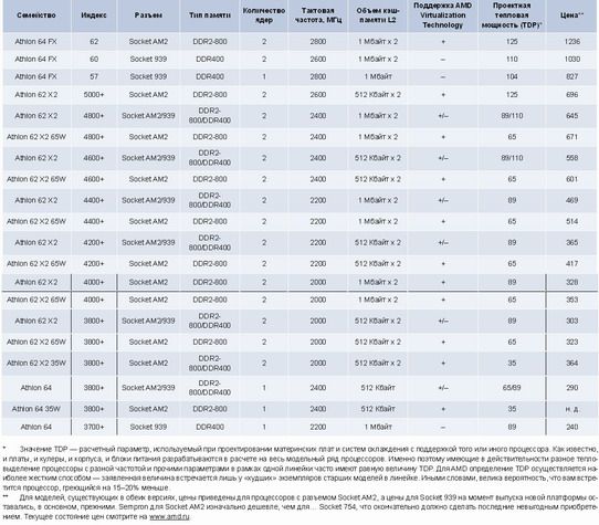 Разумеется, AMD в курсе столь незначительного превосходства обновленной платформы, и одновременно с миграцией на DDR2 она разработала также поддержку технологии AVT (AMD Virtualization Technology) как двухъядерными, так и одноядерными процессорами из нового семейства (за исключением Sempron), и солидный список новых моделей, доступных только для Socket AM2. А для тех потребителей, которые не считают своим долгом покупать непременно все самое новое (скажем, ценят исключительно «езду», пренебрегая «шашечками», или желают обновить старый компьютер, сохранив максимум имеющегося железа), продолжен выпуск моделей для Socket 939, цены на которые неизбежно будут снижаться.