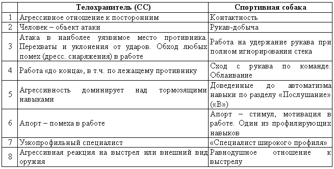 Как видно из этой таблицы, спортивная собака имеет другую ориентацию и множество моментов, попросту «противопоказанных» телохранителю. Однако практика показывает, что из «спортсмена» с хорошими задатками и данными можно подготовить хорошего охранника и даже собаку сопровождения. Думаю, полезной будет и упрощенная сравнительная таблица «охранника» и «собаки сопровождения».