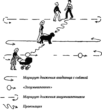 При применении второго варианта неожиданного обрыва очень полезно совмещение его с отработкой элемента защиты хозяина Последний располагается в 1 -2 метрах перед собакой, которую удерживает хелпер. Чтобы собака не отвлекалась на хелпера, ее внимание следует «переключить» на одного из «злоумышленников» Хелпер должен отпустить собаку через 2-3 секунды после начала схватки злоумышленника с хозяином Трудно переоценить значение упражнения «Тротуар» (рис 13) Владелец с собакой движется по прямой (отрезок 50 метров) Фигуранты (4-5 человек) произвольно движутся в двух направлениях, имитируя «прохожих» По очереди они набрасываются на владельца спереди, сзади и сбоку Особое внимание следует уделить «боковым» атакам, когда «злоумышленник» некоторое время движется рядом с собакой, затем – рядом с хозяином параллельным курсом. Это упражнение подготавливает собаку к четкой работе в условиях оживленной улицы. В части отказа от корма на этом этапе следует отработать наиболее сложный вариант, когда «злоумышленник» набрасывает корм по дуге, прямо на морду собаки. В реальной жизни этот вариант наиболее распространен, поскольку он наиболее эффективен (собака рефлекторно схватывает летящий кусок пищи) и безопасен для злоумышленника. Говоря о подражательном методе дрессировки, нельзя не упомянуть об упражнении «Стайная атака», преследующем сразу несколько целей: увеличение темпа атаки, правильная ориентация агрессивности «учеников», придание уверенности более слабым собакам. На практике это упражнение выглядит следующим образом: группа выстраивается вогнутой цепочкой. «Злоумышленник» располагается в 10 метрах. Возбудив собак замахом палицы, он убегает. По сигналу инструктора группа начинает преследование. Затем одна собака выполняет лобовую атаку. Остальные участники останавливаются и «поддерживают» работу своего «товарища». «Стайная атака» (рис. 14)