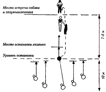 Попытка увода собаки за ошейник должна активно-агрессивно пресекаться собакой. При проверке этого элемента «злоумышленник» может давать любые команды, набрасывать корм на морду собаки, приближаться к собаке в любом темпе. Собака также должна обладать своеобразным тактическим мышлением: уклоняться или перехватывать удары, уметь вести борьбу со «злоумышленником», не имея возможности кусать его Если собака выполняет все вышеуказанные навыки, можно переходить к III блоку. III блок 1) Закрепление навыков самостоятельной работы. 2) Отработка «высокой атаки» (атака «килем»). 3) Работа по лежащему сопернику. 4) Отучивание от самостоятельного прекращения борьбы. 5) Фактор внезапности. 6) Шлифовка навыка «зона интенсивной охраны». 7) Отвлекающие факторы. Занятия 13—15 разделены для каждой собаки на две равнозначные части: работу на дрессировочной площадке и работу в реальных условиях. Основными являются навыки №№5, 6. Фактором внезапности является ситуация, когда злоумышленник в течение 5-7 минут усыпляет бдительность собаки (спокойный разговор с хозяином) и затем резко меняет линию поведения («вскидывание» оружия, замах, грубое обращение и т. д.). Собака должна мгновенно атаковать «злоумышленника». «Зона интенсивной охраны» является «профилирующим» навыком для телохранителя (рис. 17).