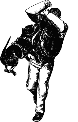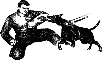 В конечном счете, моделирование подобных ситуаций зависит только от фантазии и опыта инструктора. После окончания III блока собака должна являться фактически подготовленным сопровождающим охранником. 19-е занятие проводится на квартире. Торопиться здесь не следует: на 19-м занятии достаточно уверенной в себе собаки в присутствии ее владельца. После этого желательно сделать перерыв на 2-3 недели. После перерыва следует приступать к отработке заключительного – IV блока. На 20-м занятии на дрессировочной площадке отрабатываются навыки с использованием осложненных отвлекающих факторов: отвлечение собакой или котом, использование сильных запаховых отвлечений, включающих тормозящие механизм собаки в соответствии с генетической программой. Таковыми можно считать выделения течной суки или щенячий «морковный» запах. На этом же занятии проводится знакомство с кровью. На этом моменте следует остановиться подробнее. Прежде всего необходимо установить реакцию на кровь. Практика свидетельствует, что некоторые собаки после получения крови становятся вялыми, сонливыми. Другие, наоборот, – приходят в возбужденное состояние. Из этого и следует исходить при постановке на кровь. В любом случае хлынувшая неожиданно кровь может оказаться для собаки настолько неожиданным фактором, что помешает выполнить ее «работу» (рис. 19). 21-е занятие носит название «веселого». Его назначение – познакомить собаку с ситуацией, когда ей предстоит атаковать человека, бесстрашного по причине алкогольного опьянения.