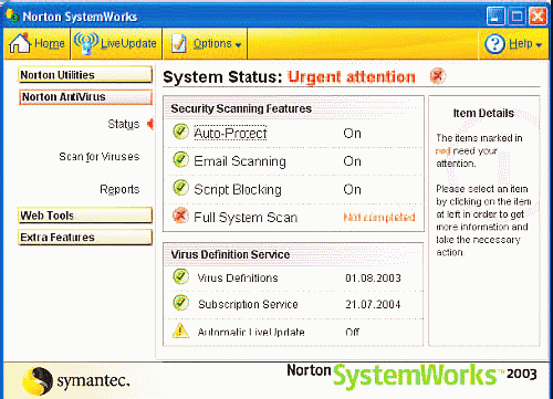 "Самые полезные программы: утилиты" - читать интересную книгу автора (Леонтьев Виталий Петрович)NORTON ANTIVIRUSNorton Antivirus является самым-самым сразу по целому ряду позиций. Самый красивый, самый логично устроенный. Обладатель самой большой базы данных вирусов. И – увы! – самый массивный, неповоротливый и требовательный к ресурсам. Красота даром не дается… Впрочем, не красотой единой жив Norton Antivirus, но и умением тоже.