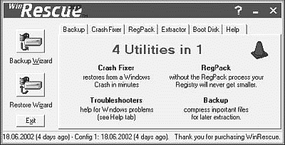 Эта маленькая, но шустрая утилита успешно конкурирует с громоздкими системами сохранения и восстановления конфигурации, встроенными в Windows. Не отличаясь кардинальностью подхода (сохраняются лишь реестр и дополнительные файлы настройки) WinRescue вполне способна обеспечить «откат» на последнюю стабильную конфигурацию. Причем работоспособную Windows для этого иметь не обязательно – программа умеет загружаться с аварийной дискеты (подготовленной с ее же помощью). Увы, версии программы для Windows NT/2000/XP способны работать в режиме командной строки только в тех случаях, если ваш диск отформатирован под FAT16 или FAT32. Проживающим под файловой системой NTFS придется все-таки загружать свои покосившиеся окошки и уж затем запускать WinRescue. Программа оснащена встроенным «диагностом», который сможет помочь вам отследить некоторые проблемы в конфигурации системы. |