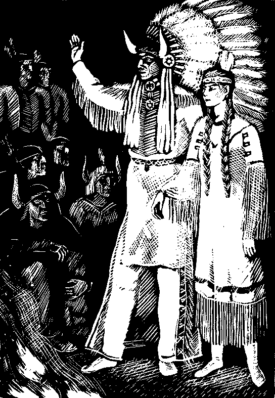 Высокий Орел встал рядом с ней. Затем она услышала его голос: — Прости, Горькая Ягода, что я прервал тебя и ты не задал всех вопросов, которые полагается задавать в таком случае женщине и мужчине. Да, Та-ва не нашего племени. Она белая. У нее другая кровь. Да, наш народ не видел от белых ничего, кроме обмана, страданий и смерти. Но мы знаем и других белых. Некоторые из них уходили к нам, брали в жены наших девушек и до конца жизни оставались в наших селениях. Мой отец рассказывал про человека по имени Моква-ай-пво-атс, Просыпающийся Волк. Он пришел в племя черноногих совсем молодым и попросил разрешения жить вместе с ними и делить все их радости и несчастья. Ему было в то время пятнадцать Больших Солнц. Вождь пиеганов, Одиноко Ходящий, принял его, как сына. Он прожил у пиеганов до смерти и был счастлив. И его дети тоже были счастливыми[*]. Ты знаешь, Горькая Ягода, что дочь Повхатана, великого вождя алгонкинов, прекрасная Покахонтас, вышла замуж за англичанина, большого вождя в своем племени, и уехала в страну белых, где ее называли прин-це-сса. Ты знаешь, что Та-ва не такая, как все остальные белые. Она пришла к нам с Квихпака, из земли людей с волосатыми лицами, которых называют тлинкитами. А в землю тлинкитов она пришла из страны Наукан. Но ее родина еще дальше, на расстоянии пути Большого Солнца. Когда она появилась у нас, мы думали, что белые будут искать ее и придут по ее следам к нашему селению. Но она засмеялась, когда мы сказали ей об этом. Она ответила, что вождь ее племени Сарь прогнал ее в Наукан за то, что она хотела освободить людей своего рода из резервации. Вождь ее племени был предателем своего народа, подобно предателю Ункасу, из-за которого погиб мой дед Текумсе… Воины, слушавшие слова Высокого Орла, одобрительно зашумели. Глаза колдуна сверкнули недобрым огнем. Леоо-карко-оно-маа поднял руку, призывая к молчанию. — Я разговаривал с Та-ва несколько раз. У нее сердце и мысли свободного человека. Она просила меня и Совет Старейшин, чтобы ей разрешили остаться в племени. Совет Старейшин ответил «да». Высокий Орел повернулся к старикам, сидевшим в багровом круге огня. — Разве лживы мои слова? — Нет, — склонили головы старики. — Разве Совет Старейшин меняет когда-нибудь свое слово? — Нет! — Ее назвали шауни. Значит, она — шауни, как мой отец, как мой дед, великий Текумсе, как мой будущий сын! Он обратил лицо свое к колдуну, стоящему против него. — Горькая Ягода, ты не задал последнего вопроса, который полагается задать по обычаю. Говори. Колдун помедлил несколько мгновений, потом сделал шаг к Станиславе и протянул вперед обе руки. — Та-ва, — сказал он. — Хочешь ли ты быть женой человека по имени Леоо-карко-оно-маа? — Да, — ответила Станислава. Ладонь, придерживающая ее локоть, сжалась. — Высокий Орел, хочешь ли ты быть мужем этой женщины по имени Та-ва? — Да. — Ты можешь ввести ее в свой типи, Высокий Орел. Отныне и навсегда! Станиславе показалось, что в голосе колдуна прозвучала скрытая угроза. Конец обряда она помнила смутно. Она не видела свадебного танца Горькой Ягоды, голоса воинов и женщин слились в неясный гул, от нервного напряжения кружилась голова, шелестели перья в праздничном уборе мужа. Он нес ее на руках через волны цветного тумана, крепко прижав к груди. Покачивались темные вершины лиственниц. Звезды голубыми искрами сыпались с неба. И се