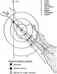 Согласно Хроникам Земли, первые поселения аннуна-ков на нашей планете были «провозглашены центрами». Не менее загадочно и утверждение царей, живших после Всемирного потопа и восстанавливавших в Шумере стёртые с лица земли города. Они заявляли, что они следовали: Ключ к раскрытию этой тайны можно получить, отметив основанные Энки и Энлилем города на карте и соединив их концентрическими окружностями. Действительно, получаются «центры». Города располагаются на равном расстоянии от Центра управления миссией в Ниппуре. Это мог быть только план «Небес Высоких», поскольку такое расположение имело смысл лишь для тех, кто мог смотреть на Ближний Восток, поднявшись высоко в небо. Выбрав двойную вершину Арарата – самый заметный топографический ориентир региона – в качестве опорной точки, аннунаки расположили космопорт в месте, где меридиан Арарата пересекает реку Евфрат. Согласно этому «извечному размеченному плану» все города расположились в виде стрелы, обозначая посадочный коридор к космопорту в Сиппаре (рис. 25).