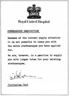 Удовлетворить вашу заявку на стетоскопы в настоящее время не представляется возможным в силу сложностей с поставками. Взамен мы готовы предоставить вам определенное количество более длинных трубок для уже имеющихся у вас стетоскопов. Отдел материально-технического снабжения К моему удивлению, сэр Хамфри не усмотрел в документе ничего странного и даже заметил, что коль скоро такие трубки имеются в наличии, то предлагать их не только можно, но и нужно. А Бернард, в свою очередь, высказал предположение (надо же до такого додуматься!), что это избавит врачей от многих неудобств: пользуясь удлиненными трубками, они, мол, смогут, не сходя с места, прослушивать пациентов по всей палате. Надеюсь, он все-таки пошутил. Иначе… Затем я ознакомил своего постоянного заместителя с распоряжениями, касающимися морга и туалетной бумаги, которые были отданы в больнице Сент-Стефан.