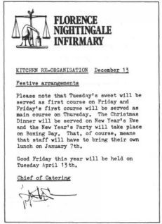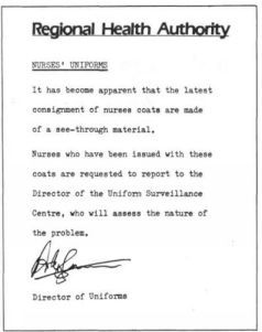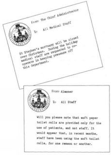 ВСЕМУ МЕДИЦИНСКОМУ ПЕРСОНАЛУ В связи с закрытием морга на рождественские каникулы администрация больницы убедительно просит медицинский персонал не загружать работой данное подразделение в указанный период. Главный администратор ВСЕМУ ПЕРСОНАЛУ В последние месяцы участились случаи, когда работники больницы для тех или иных целей пользуются туалетной бумагой. Администрация еще раз напоминает о том, что рулоны туалетной бумаги предназначены для пациентов, а не для персонала. Зав. хозяйственным отделом Сэр Хамфри пренебрежительно хмыкнул. – Наше здравоохранение работает эффективно и экономично ровно настолько, насколько этому не мешает наше правительство. Тогда я предъявил ему просто убийственный по сути своей документ, подписанный начальником отдела контроля за соблюдением правил ношения рабочей одежды (ОКСПНРО) районного управления здравоохранения.