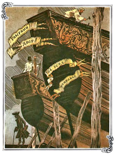 Много в Петербурге жителей, много самых разных мастеров. А больше всего кораблестроителей и моряков. Построены в столице Литейный двор, где пушки льют, кузницы, смолокурни, лесопилки, прядильные, канатные и парусные дворы, якорные мастерские и верфи. Адмиралтейская — главная. Галерная верфь куда меньше Адмиралтейской. И суда здесь строят не такие могучие, не корабли, не фрегаты, а скромнее — парусно-вёсельные галеры. А стоит Галерная верфь на отшибе — в устье реки Фонтанки, недалеко от залива. Но жизнь кипит здесь так же бурно. На стапелях строятся десять галер. Стучат топоры и молоты. Лошади тянут из амбаров лес. Дымок смолокурен сливается с бодрым морским ветром.