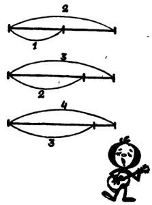 — Правильно. Звук при этом получается выше не на октаву, а на так называемую квинту. И происходит это тогда, когда струну делят в отношении 3:2. А теперь разделим струну в отношении 4:3. Попросту прижмём её на расстоянии трёх четвертей. Что получилось? Получился звук ещё чуть ниже, чем тогда, когда мы ущипнули две трети струны. Этот интервал между высотой звучания всей струны и высотой звучания трёх её четвертей называется квартой.