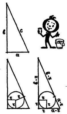 — Слова прошу я! — сказала Таня. — Предлагается вычислить радиус круга, вписанного в прямоугольный треугольник. При этом известно только то, что гипотенуза равна 13 дециметрам, а сумма обоих катетов — 17 дециметрам.