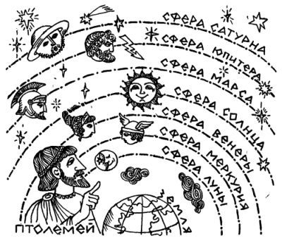 — В древние времена, — начал Сева, — известно было пять планет: Меркурий, Венера, Марс, Юпитер и Сатурн. Солнце и Луна тоже причислялись тогда к планетам. Всего, стало быть, по тем временам планет было семь. А устройство мироздания тогда представляли себе так. В центре Вселенной помещается неподвижная твердь — Земля. Вокруг Земли обращаются планеты. Каждая планета укреплена на своей собственной сфере (или на своём небе) и обращается вокруг Земли вместе с ним. Первое небо — небо Луны, за ним идёт небо Меркурия. Следующее, третье небо принадлежит Венере. За ним следуют небеса Солнца, Марса, Юпитера и Сатурна. Небо Сатурна было седьмым, и последним планетным небом.