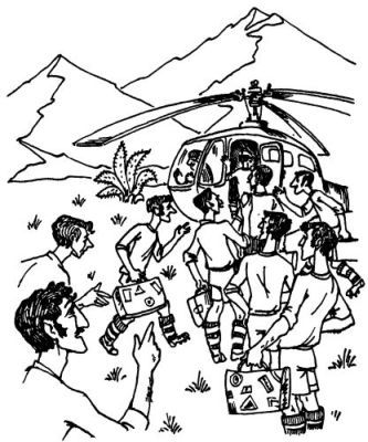 — Через несколько часов, — сказал он, — на высокогорном стадионе начнутся футбольные соревнования между командами Терранигугу и Сьерранибумбума. В них примут участие все команды обеих стран, кстати отправляющиеся на соревнования без запасных игроков. Добраться до стадиона можно только вертолётом. Но так как Терранигугу — страна бедная, то у нас имеется всего один вертолёт, который делает в сутки два рейса и не может, к сожалению, перевезти за один день всех участников.