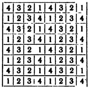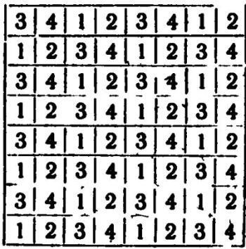 Нулик взял клетчатую бумагу, обвёл 64 клетки (по восьми в каждом ряду) и стал рисовать в них. собак. Но отличить болонку от таксы по его иллюстрациям не было никакой возможности. Тогда Таня предложила помещать в клетки не самих собак, а их номера. Недаром Чёрный Лев присвоил каждой породе собак порядковые номера! И вскоре перед нами лежала такая таблица: