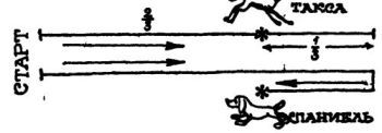 — Будут тебе и другие Рассуждаю так: за то время, что такса одолела 2/3 дорожки, болонка, которая бежит в четыре раза быстрее таксы, пройдёт 8/3 пути, то есть 2 2/3а. Иначе говоря, болонка успела пробежать дважды дорожку, да ещё 2/3 её и, следовательно, тоже поравнялась и с таксой, и со спаниелем.