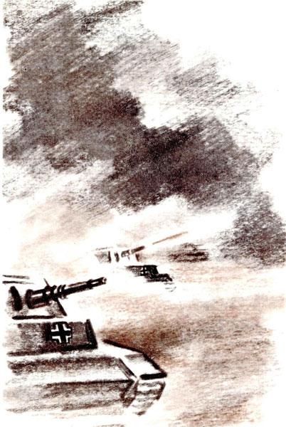 Все наши танки окопались в земле. За левым флангом следила рота тридцатьчетверок. Они уже тогда прославились подвижностью, крепостью брони. Лёгкие танки были сосредоточены в центре. Только по особому приказу, если вражеская пехота прорвётся через окопы, они могли вылезти из укрытий, вести бой на открытой местности. Броня на них была не толстая. Снаряды прошивали их насквозь. И с танками врага сражаться они не могли. Но вот кончилась вражеская артподготовка. Один наш танк горел. Экипаж успел выбраться из него. Внутри танка взорвались снаряды. Толстый чёрный столб дыма вытянулся в небо. – Уже все наши позиции были затянуты пылью. От леска окопы не были видны. И вот выползли из-за холмов танки. Казалось, они не спешили, сворачивали влево и вправо от дороги. За ними шли солдаты. И вдоль скатов холмов побежали их фигурки. Видно было, как начали рыть окопы, а наблюдатели устанавливали стереотрубы. У нас стояло полное молчание. Комбат Король наметил четырёхсотметровый рубеж. Ждали, когда танки достигнут его… Танки врага подошли метров на восемьсот, вдруг разом взревели. Стреляя на ходу, устремились к центру наших позиций. Начался бой. Хотя секунды в бою имеют решающее значение, но только рукопашные схватки кончаются быстро. Обычно же секунды складывались в долгие минуты и часы. Этот первый бой нашей бригады длился около двух часов. Едва передние танки достигли четырёхсотметрового рубежа, разом ударили наши танки и тяжёлые KB первого батальона. Они ударили в центр наступающих, где танки шли плотнее. Две вражеские машины сразу же загорелись. Немецкие наблюдатели мигом засекли наши огневые точки. И заметили, что на правом фланге, где дорога огибает овраг, пушек наших нет. Несколько танков устремились к повороту. На ходу обстреляли поворот дороги, видимо думая, что там мины. – Но мин, как ты помнишь, там не было. Однако едва две передние машины оказались на повороте дороги, ударили издали тяжёлые KB, которые прежде пристрелялись к этому месту. Передний танк развернуло, пушка его опустилась. Второй хотел обойти его. Подставил бок сорокапятке в лощине. Она дважды шлёпнула по гусеницам, разбила их. И оба танка остальным перекрыли дорогу…