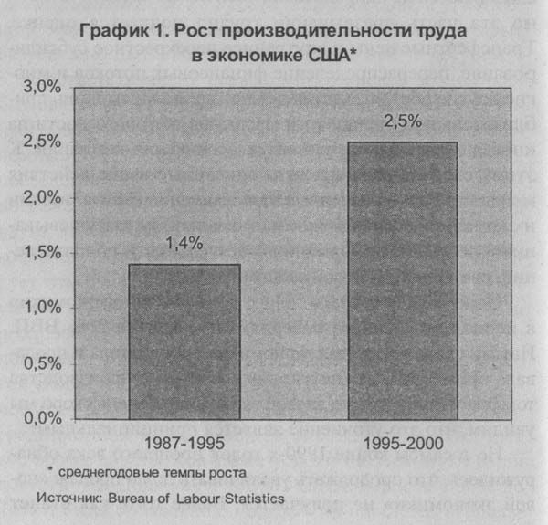 Одновременно с этим в американской экономике происходил и другой процесс — увеличение темпов роста инвестиций в информационные технологии. Если с 1987 по 1995 год инвестиции в информационные технологии росли со скоростью 11% в год, то в 1995–2000 годах они увеличивались до 20,2% в год, то есть скорость роста выросла почти в два раза (график 2).