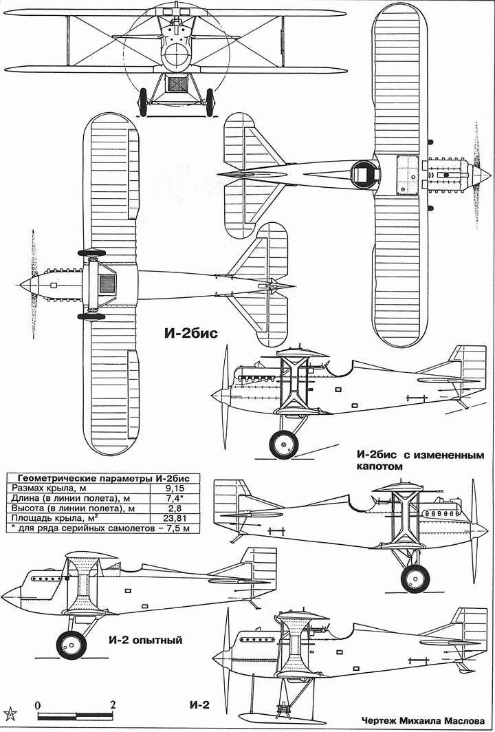 Краткое техописание истребителей И-2 и И-2бис И-2 и И-2бис представляли собой одномоторные классические бипланы смешанной конструкции. Экипаж – один человек. Фюзеляж овального сечения смешанной конструкции, в средней части имел металлическую ферму, начиная с кабины пилота представлял собой деревянный монокок с обшивкой из шпона, выклеенной на специальной болванке и одетой на каркас. Перед открытой кабиной пилота в центральной части фюзеляжа располагался основной топливный бак емкостью 200 л. Бипланная коробка состояла из крыльев одинакового размаха, без выноса и поперечного «V», центрального И-образного узла (т. н. кабана), выполненного из профилированных стальных труб, и межкрыльевых Х-образных дюралевых стоек, причем у И-2 стойки были сплошными, зашитыми листом. Конструкция усилена межкрыльевыми профилированными расчалками: у И-2 одинарными, у И-2бис – сдвоенными. Крылья двухлонжеронные, деревянные, элероны располагались только на нижнем крыле, при этом выступали за контур задней кромки. Обшивка крыльев И-2 была выполнена из фанеры. На крыльях И-2бис фанерой зашивался только носок до первого лонжерона, далее использовалось полотно. Задняя кромка выполнена из стальной проволоки, на виде в плане представляла собой волнообразную линию. В центроплане верхнего крыла находился расходный топливный бак емкостью 96 л, в центральной части которого размещался простейший поплавковый бензиномер. Штырь поплавка (т. н. камыш), вынесенный наружу в специальном трубчатом кожухе с мерным стеклом, по мере расходования бензина опускался вниз. Хвостовое оперение, как и элероны, имело дюралевый каркас и обшивку из полотна. Шасси весьма распространенной в те годы пирамидальной схемы имело опоры из стальных профилированных труб. Амортизация – резиновые шнуры диаметром 16 мм. Двигатель М-5 мощностью 400 л. с. был тщательно закапотирован. Имелось, как минимум, по два различных варианта капота для И-2 и И-2бис. Основным «украшением» центральной верхней части капота являлась скошенная навстречу набегающему потоку труба, через которую воздух поступал к двум карбюраторам «Зенит». Перед ней в развале блока цилиндров размещался расширительный бачок системы охлаждения двигателя, основным элементом которой являлись пластинчатые радиаторы системы «Ламблен». Радиатор для получения максимума охлаждения отклонялся вниз до 70° (управление из кабины пилота). Часть самолетов И-2 имели неподвижные сотовые радиаторы, вплотную примыкающие к фюзеляжу. Вооружение составляли два синхронных пулемета «Виккерс» или ПВ-1 калибра 7,62 мм с запасом по 500 патронов на ствол. На большинстве И-2 пулеметы значительно выступали за контур фюзеляжа, на И-2бис они были частично утоплены в фюзеляж.