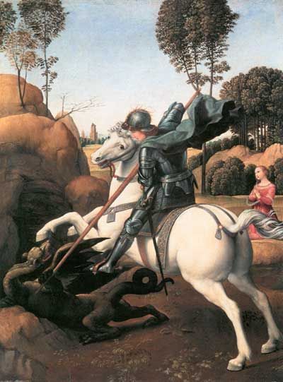 Рафаэль Санти. Св. Георгий и Дракон. 1504-1506 г. Вашингтон. Главою посольства был назначен граф Бальдассаре Кастильоне, и ничего приятнее не могло быть для Рафаэля, как то, что первое его произведение, выходящее из пределов Италии, повез один из его лучших друзей. Кастильоне не упустил, конечно, случая в личном разговоре передать все надежды, возлагаемые на молодой талант. В самом деле, в этой прелестной картине, украшающей теперь наш Эрмитаж наряду с другим шедевром Рафаэля – «Мадонной Конестабиле», поражает не только искусство письма и рисунка, но глубокое одушевление художника. «Чудовище поражено ударом, который наносит ему скачущий на белом коне святой, и редко в творениях даже самого Рафаэля встречаешь больше смелости и огня, чем здесь. В лице святого отражается холодная решимость и отвага. Вся фигура его дышит силой и ловкостью; он пришпорил своего коня, поднявшегося на дыбы и с ужасом отворачивающегося от чудовища. Святой наклонился, нанося удар копьем; красивое лицо его зарделось, а надетый поверх брони плащ развевается по ветру. Чудовище еще упирается с силою передними ногами, но видно, что наступает ему конец: из его пасти слышится последнее рычанье и хвост стянут в судорожном движении. Как бы для большего оттенения подвига святого видна вдали царица Александра – на коленях, величественная и прекрасная, полная веры и надежды на избавление». Действие происходит среди красивой долины. Слева лесная трущоба и пещера, служившая жилищем чудовищу. За царицею – красивые деревья и кустарник, а вдали церковь. То, как написаны золотой шлем, окруженный сиянием, стальная броня, белый конь, украшенный золотою с голубым сбруей, а также общий тон картины, среди которой выделяется белое пятно лошади, чистота и блеск красок, сила и гармония любовно исполненных, несмотря на малые их размеры, подробностей, и безукоризненное благородство в рисунке ясно показывают, какого совершенства уже достиг двадцатитрехлетний Рафаэль. «Поистине королевским подарком отплатил королю Генриху VII Гвидобальдо Урбинский», – говорит об этой картине Кавальказелле – лучший знаток искусства в наше время. По мнению Ваагена, известного знатока, описавшего наш Эрмитаж, Рафаэль вложил в изображение св. Георгия всю имевшуюся у него в то время силу творчества, и оттого оно, будучи миниатюрным, но притом вполне серьезно и с любовью исполненным, несравненно выше всех остальных его маленьких картин. Неизвестно, каким образом попала эта картина из королевского дворца к графу Чемброку в XVII веке. Английский король Карл I опять приобрел ее у графа, выменяв на собрание рисунков Гольбейна. После смерти Карла I имущество его было распродано по приказанию Кромвеля. За «Св. Георгия» было заплачено 150 фунтов (1500 рублей). Картина попала в Париж и наконец в прошлом веке была приобретена Екатериной II для Эрмитажа вместе со всем собранием галереи Кроза. «В 1812 году ее повесили в галерее генералов в Зимнем дворце вместо иконы по приказанию императора Александра I, находившегося тогда в сильно мистическом настроении. После пожара во дворце картина была перемещена в Георгиевский зал, опять-таки в качестве иконы; перед нею теплилась лампада. Наконец при окончательном устройстве нынешнего здания Эрмитажа картина возвращена туда по Высочайшему повелению вследствие представления хранител