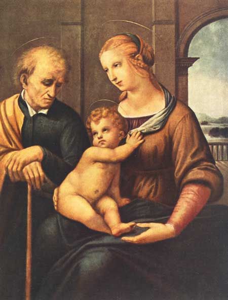 Рафаэль Санти. Мадонна с безбородым Иосифом. Около 1505 г. Идеала своего достиг он, кажется, вполне в так называемой «Мадонне Темпи», где Мария с тихой радостью прижимает ребенка к своей груди, готовясь осыпать его поцелуями… Но художник не дозволяет ей исполнить это, как бы находя, что в поцелуе уже слишком много земной страсти, «недостойной того почтения, которое подобает, хотя бы и горячо любимому, Божественному Сыну». Впрочем, в одном лишь этом, быть может, еще сказывается католический символизм Рафаэля, во всех же других отношениях между первой его флорентийской «Мадонной дель Грандука», на которой еще заметна печать кисти умбрийца, и «Мадонной Темпи», свободной от этого влияния и представляющей именно только идеал человеческой, женственной матери, – длинный путь, пройденный постепенно. Рафаэлем написан целый ряд Мадонн «с книгой», являющихся видоизменениями нашей эрмитажной Мадонны. В них во всех, напротив, сохраняется больше умбрийское отвлеченно-религиозное начало, и потому, конечно, они долгое время с особенной любовью воспроизводились на гравюрах при печатных «божественных» книгах. Богатство фантазии Рафаэля особенно ярко проявляется в сохранившихся рисунках его, в картинах. Рассматривая их, мы видим, что он не только не затруднялся никогда в мотивах, но разнообразие последних так велико, что многие из них остаются неиспользованными.