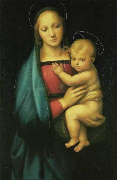 Рафаэль Санти. Мадонна Грандука. 1505 г. Флоренция, галерея Питти. Незначительна по величине, но пластически выразительна «Мадонна Орлеанская», принадлежащая теперь герцогу Омальскому. Попавшая в Англию после того, как король Филипп Эгалите продал ее вместе с другими сокровищами искусства в уплату карточных долгов, сейчас она снова вернулась во Францию. Одну из особенностей ее составляют богатые волосы – смелая вольность, так как лучшее Мадонна написана в профиль. Верхняя одежда упала с ее плеч, и гибкие, прекрасные формы обрисовываются плотно облегающей тело тканью. Она держит младенца, обнимая его одной рукой, между тем как на ее другую руку опирается он ножкой, стараясь достать грудь матери. Не менее прекрасны обе «Мадонны Колонна» из галереи Бриджватер. Эти картины отличаются еще большей пластичностью форм и энергией образов. На первой из них мать отложила книгу и с сердечной радостью смотрит на живые движения уже подрастающего младенца.