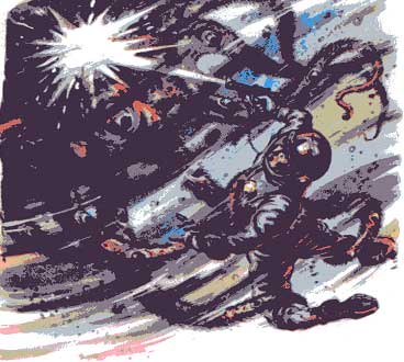 Командир нажал клавишу, и стены домика растворились в потоках дождя. Перед ними лежала каменная равнина. Вдруг она вздыбилась. Поднятые водяными фонтанами валуны проносились по воздуху, с грохотом обрушиваясь вниз. Голографический эффект был настолько силен, что новичок вскрикнул, увидав нависшую над головой глыбу величиной с дом. Когда стены домика вновь появились, он, полуоглохший, с трудом расслышал слова командира: