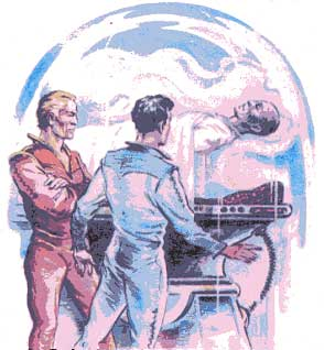 Они стояли у подножия зеленых скал, возле края прозрачного купола. Морис лежал на спине на. небольшой платформе, смотрел через купол на зеленоватые глыбы скал, синий мох, местами покрывающий камень. Командир, угадывая его невысказанное желание, нажал кнопку. На платформу надвинулась прозрачная крышка. Воздух под крышкой задымился, сгущаясь до синеватого тумана. Воздушные струи мягко приподняли тело Мориса, затеребили края одежды. Командир включил информационный блок гипносна. Сказал устало: