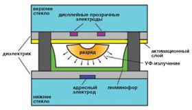 При изготовлении панель наполняют смесью инертных газов на основе гелия или неона с добавлением ксенона, под низким давлением, 10–300 мм рт. ст., накладывают верхнее стекло с диэлектриком и запаивают. Активационный слой (окись магния) служит для повышения эффективности ячейки. А эффективность просто-таки фантастически низка - КПД плазменной ячейки не превышает десятых долей процента, то есть подводимая к панели мощность практически вся преобразуется в тепло. Эффективность плазменной ячейки составляет лишь 3% от ЖК, у которой, как известно, она тоже не на высоте (правда, директор quot;плазменногоquot; подразделения Panasonic Хироюки Нагано утверждает, что за последний год КПД ячеек удалось повысить вдвое). И традиционные плазменные панели чудовищно прожорливы - из 500 Вт подаваемой мощности собственно в свет преобразуется не больше 0,5#8194;Вт, остальное рассеивается в окружающую среду. Это порождает кучу проблем, связанных не только с необходимостью рассеивать тепло: например, при высокой температуре люминофор постепенно испаряется, загрязняя верхнее стекло, что и приводит к известному эффекту quot;выгоранияquot; плазменных панелей. В плазменных панелях невозможно менять интенсивность свечения с помощью изменения напряжения, потому полутона формируют, изменяя время горения ячейки в течение одного цикла работы (так называемую скважность). Поскольку речь идет о микросекундах, к быстродействию ячейки предъявляются определенные требования. quot;С нуляquot; она зажигается слишком долго; вдобавок время зажигания сильно зависит от того, как давно ячейка включалась в прошлый раз. Чтобы точнее регулировать среднюю интенсивность свечения, приходится удерживать ячейку на грани срабатывания - обычно это делают, выставляя на дисплейных электродах погашенной ячейки напряжение выше поддерживающего, но недостаточное для зажигания. Кроме того, используют вспомогательные ячейки без люминофора, которые включены постоянно и служат поставщиками ионизированного газа в основные ячейки через специальные зазоры. Все это, кроме более точного регулирования времени горения, позволяет снизить напряжение зажигания (а значит, и потребляемую мощность). Однако ведет к неприятностям другого рода#8194;- ионизированный газ хоть и очень слабо, но тоже светит, отсюда и проблемы с получением quot;настоящего черногоquot;. О недостатках и проблемах этой ужасной с точки зрения нормального инженера конструкции можно рассказывать долго. Так почему же столь горячее, хрупкое и капризное чудовище обрело такую популярность? Все дело в двух обстоятельствах. Во-первых, какое-то время ни одна массовая технология, кроме PDP, не позволяла получить плоский дисплей достаточных размеров, к тому же такой, для которого отдельные панели можно составлять в большие экраны практически без швов. Во-вторых, несмотря на жутковатые принципы устройства и отсутствие нормального черного, PDP превосходно (лучше многих ЖК-матриц) и независимо от углов обзора передают цвета, а также обладают высокой яркостью и, как следствие, контрастностью (у вышеупомянутого Panasonic TH-R42PY85 этот параметр удалось довести до 30000:1, а в динамике - аж до миллиона к одному). В студиях, конференц-залах, на эстрадных сценах плазменные панели вне конкуренции, особенно учитывая их способность работать при температурах до –60 °С. Как показал о