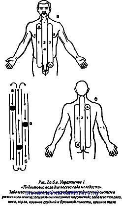 "Дорога в молодость и здоровье. Практическое руководство для мужчин и женщин" - читать интересную книгу автора (Норбеков Мирзакарим Санакулович, Фотина...)ПЕРВЫЙ КОМПЛЕКС УПРАЖНЕНИЙ ИЗ 1-Й СТУПЕНИРазминка. (Разминка проводится по описанию в основном курсе.) Упражнения на позвоночнике Шея 1. Наклоны головы вперед и назад до упора. 2. Наклоны головы вбок не поднимая плеч. 3. Повороты головы влево-вправо до упора. 4,5. Круговые движения головой, как бы катая по плечам. 15 раз по часовой стрелке, 15 раз против часовой стрелки. Верхний плечевой пояс 6. Плечи вперед, подбородок к груди, плечи назад, голову назад. 7. Движения плечами вверх-вниз ("черепаха"). 8. Круговые движения плечами вперед и назад. 9. Наклоны влево-вправо, руки по швам. Средняя часть позвоночника (грудной и поясничный отделы) 10. Ноги на ширине плеч, повороты влево, с каждым поворотом максимальный разворот назад, голова вертикально, повороты вправо. 11. Наклоны вперед, как бы стараясь достать носом пуп. 12. Наклоны назад, как бы стараясь достать затылком поясницу. 13. Плечи вниз-назад круговыми движениями «паровозик» (руки согнуты в локтях). 14. Руки в «замок» на затылке, наклоны вправо-влево, вперед-назад (по 15–20 раз). 15. Ноги на ширине плеч, кулаки на области почек, локти максимально сведены друг к другу, наклоны назад не разгибаясь. 16. Нога на ширине плеч, стараясь увидеть боковую поверхность стопы с противоположной стороны, вправо и затем влево. 17. Руки на коленях, наклоны вперед. 18. Сидя на полу или на стуле, нога разведены и корпусом в фронтальной плоскости максимальные наклоны к левой, правой ноге и посередине. 19. Руки вверх, пальцы сцеплены, потягиваемся, вставая на носки, тянемся вверх (вдох, опускаемся, снова вверх (выдох). Упражнение 1. "Подготовка поля для посева сада молодости" (см. рис. 2а, 26, 2в). Направлено на омоложение всего организма. Суть его в подготовке своего организма к последующим упражнениям. Оно предполагает работу в различные «сезоны» и определенные виды работ по этапам: Лето (тепло и тепло максимальное). Весна (покалывание, "весенний или осенний дождь"). Зима (холод). Пахота (пульсация). Посев молодости (завершение работы). Все упражнения начинаются с ощущения Т, а заканчиваются X. В один день делается не более 4 упражнений (упражнение + еще 2–3, в зависимости от нездорового органа). Начинают упражнение с области правой ключицы (а), либо с носоглотки (рис. 2а, 26). Собираем ощущение Т размером с небольшой кулак в области ключицы, перемещаем его вниз до начала бедра, переходим в промежность и идем по середине передней поверхности тела вверх до лица, захватывая губы, полость рта и середину нижней челюсти с носоглоткой. Ощущение тепла перемещается под поверхностью кожи. Затем переходим на левую область ключицы и спускаемся вниз до бедра (б). После этого возвращаемся обратно тем же путем к исходной точке (а). Таких проходов делаем по три на каждое ощущение. Это первый вариант прохода ощущений. Можно это сделать так же, как изображено на рис. (2в): из (а) достигаем тем же путем (б), после чего переходим на центральное направление, идем вверх до конца, переходя затем вновь в исходное положение (а). Таким образом повторяем так же три раза каждое ощущение. Затем переходим ко второму этапу этого упражнения, выполняя аналогичные проходы сзади, начиная с проекции (а) "права по спине, достигая (б) также двумя вари