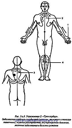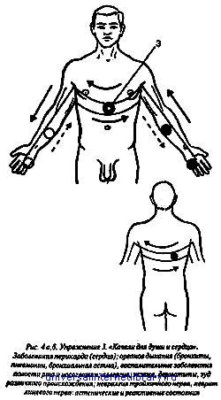 Работая со стороны спины, стараемся особенно ярко представить эти ощущения аналогична тому, как мы это делаем в упражнениях на позвоночнике. Упражнение 2. "Трон сердца" — при заболеваниях сердечнососудистой системы, толстого и тонкого кишечника, нервных расстройствах, внутричерепном давлении, при легочных заболеваниях, болезнях суставов (рис. За и 36): а) начинаем с левой ладони, охватываем лишь мизинец (1), поднимаемся по внутренней поверхности руки до подмышечной области, далее идем по дуге (2), как это показано на рис. За, поднимаясь по середине грудной клетки до яремной ямки, затем опускаясь — далее через правую подмышечную область опускаемся до внутренней правой руки, таким же образом до правой ладони, также охватываем лишь мизинец; затем возвращаемся тем же путем аналогично вновь в левую ладонь (1); б) вновь поднимаемся вверх из левой ладони по внутренней поверхности руки до подмышечной области и переходим назад, проходя по дуге (3), как это показано на рис. 36 (вид сзади), далее в правую подмышечную область, затем вниз по внутренней поверхности правой руки до ладони, охватывая лишь мизинец, затем возвращаемся тем же путем, проходя грудную клетку сзади по дуге (3) и через левую подмышечную область вновь в левую ладонь. Затем повторяем «а» и «б» еще раз, совершая таким образом всего 4 прохода; в) далее переходим в область 4, то есть на внутреннюю область голеней и коленных суставов. Собираем здесь максимальные ощущения последовательно в каждой ноге, держим несколько секунд и повторяем это по 2 раза. Все этапы упражнения лучше делать на Т + П; затем на П, затем на X + П. Заканчиваем этапом «в» на максимальном ощущении Т, начинать всегда следует с левой ладони. Упражнение 3. "Качели для души и сердца" — при заболевании перикарда сердца и органов грудной полости (рис. 4а и 46). Начинаем с левой ладони, охватывая лишь 2 пальца — мизинец и безымянный, поднимаемся вверх по внутренней стороне руки до подмышечной области, затем по дуге идем к середине в точку (3) у основания грудины. В (3) останавливаемся на 2–3 секунды и одновременно идем чуть вглубь, затем продолжаем двигаться в правую подмышечную область, далее спускаемся вниз по правой руке аналогично и симметрично левой, после чего возвращаемся тем же путем до левой ладони. Это один проход спереди. Постарайтесь его выполнять примерно за 10 секунд, не считая остановок.