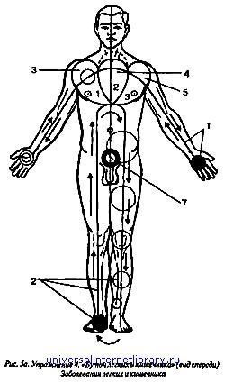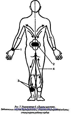 Упражнение 5. "Цветок души и разума" — при неврозах, нервных заболеваниях (рис. 6). Начинаем с любой стопы. Вариант: С правой стопы (1), поднимаясь вверх по ноге изнутри, охватывая ее внутренним взором полностью, как бы насквозь, переходим к копчику (2), затем поднимаемся по позвоночнику, проходя его также как бы насквозь, постепенно суживая область ощущения, как это показано на рис. 6, переходим на шею, затем на волосистую часть головы, где перемещаем ощущения по поверхности кожи, не углубляясь доходим до «третьего» глаза (3), где делаем небольшую, до 3–4 сек., остановку, сосредоточившись, как бы сконцентрировав внимание на этой области (3), затем возвращаемся аналогично тем же путем до области копчика (2), переходя ниже в левую ногу, также полностью охватывая ее изнутри ощущением, спускаемся до левой стопы, затем возвращаемся обратно аналогично до правой стопы. Это один проход. Таких проходов следует сделать 3–4 на каждое ощущение. Аналогично работаем с руками. Далее делаем проход по рукам, начиная с запястья, охватываем руку полностью изнутри. Через плечевой сустав на уровне плечевого пояса переходим на противоположный плечевой сустав, опускаемся в другую руку до запястья и возвращаемся, откуда начали. Таких проходов также делаем 3–4. При этом помните, пожалуйста, что при выполнении этого упражнения, в частности, передвижения ощущений по голове, у вас не должно появиться непривычных ощущений — шума, чувства тяжести в голове, делайте это легко, без напряжения. Если все же появится неприятное ощущение — следует резко уменьшить нагрузку и яркость ощущений. Упражнение 6. "Дороги царства" — при заболеваниях сосудов (артерий и вен), тромбофлебитах, стимулируем работу сердца. Начинаем с нижней трети задней поверхности правой голени (3), поднимаемся вверх, как это показано на рис. 7: на голени отклоняясь наружу, на бедре — к внутренней поверхности (4), переходя на середину промежности, мысленно проходя как бы через прямую кишку к поясничной области (2), делая здесь небольшую, до 10 сек., остановку, одновременно усиливая ощущения до максимума, проходя как бы насквозь вперед, затем — аналогично и симметрично из (2) спускаемся вниз до нижней трети задней поверхности левой голени. Затем еще раз возвращаемся так же и тем же путем до (3) на правой голени. Затем — таким же путем вверх по правой ноге через прямую кишку вновь в (2), где вновь усиливаем ощущения до максимального и делая остановку на 10 сек. Затем из (2) переходим на руки, как это показано на рис. 7: через подмышечную область по задней поверхности плеча, затем предплечья до запястья (1), где делаем небольшую, до 2–3 сек., остановку и возвращаемся тем же путем в поясничную область (2), где, как обычно, делаем остановку до 10 сек. с одновременным усилием ощущения до разумного максимума. Затем переходим на другую руку тем же путем достигая (1) и вновь возвращаемся в область (2), где после усиления ощущения и остановки до 10 сек. делаем еще по одному проходу по рукам — аналогично и заканчиваем упражнение в (2), также сделав остановку на несколько секунд и доведя ощущения до максимального.